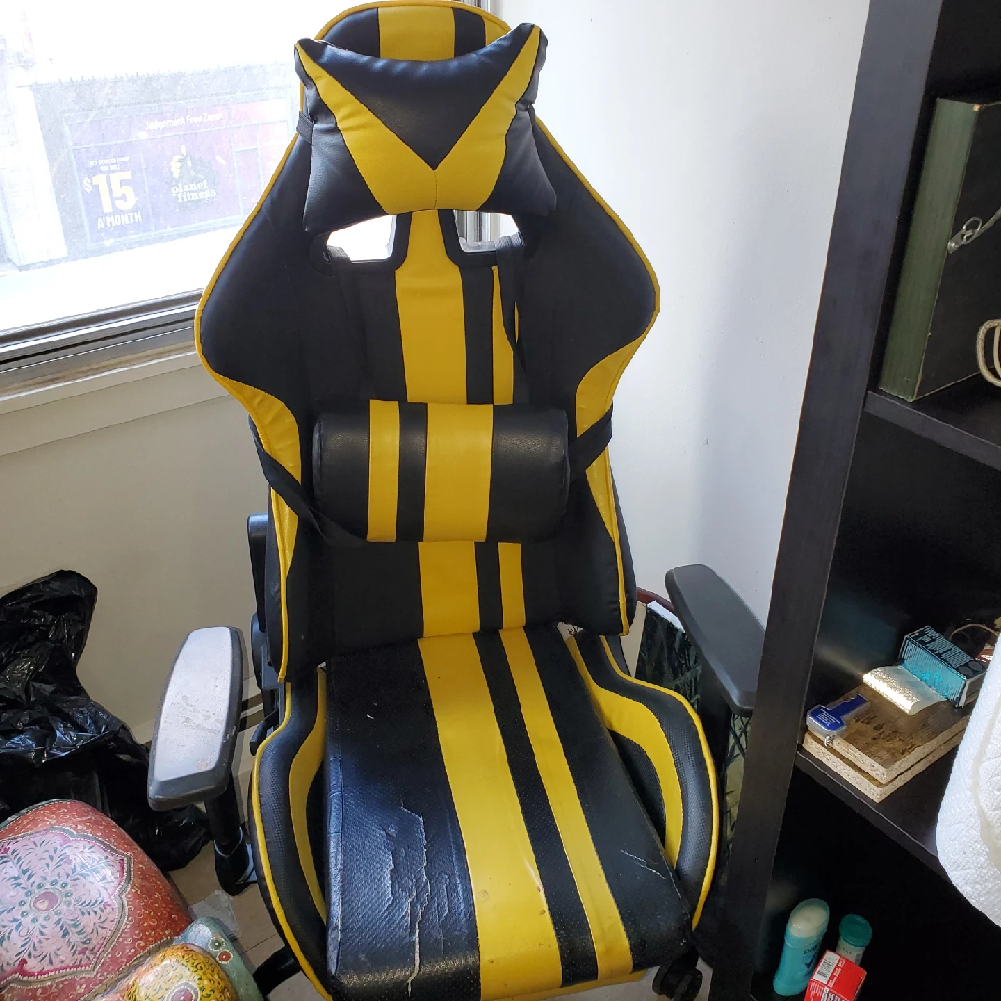 Selling a gaming chair in a striking yellow and black colour scheme. It has a headrest and lumbar support for comfortable seating. Please note there are some signs of wear on the seat