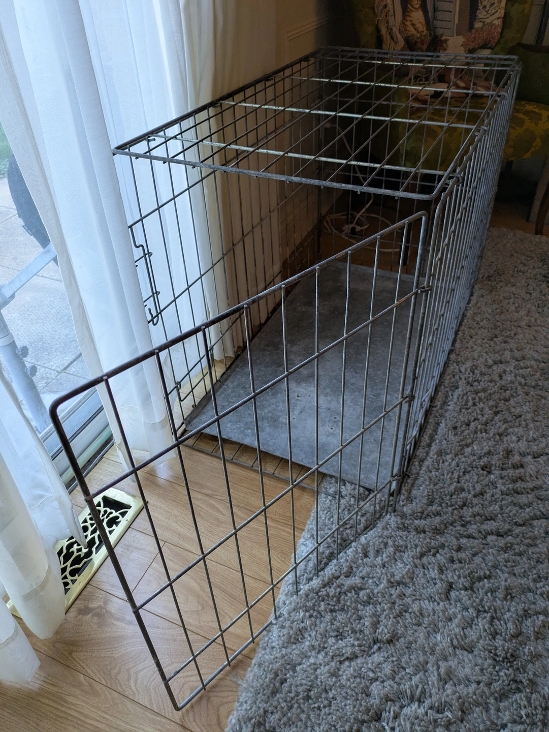 Our 44lb (20kg) puppy has lots of room so the crate would be suitable for a slightly larger or smaller dog (or even naughtyFor kids)! Priced to sell!