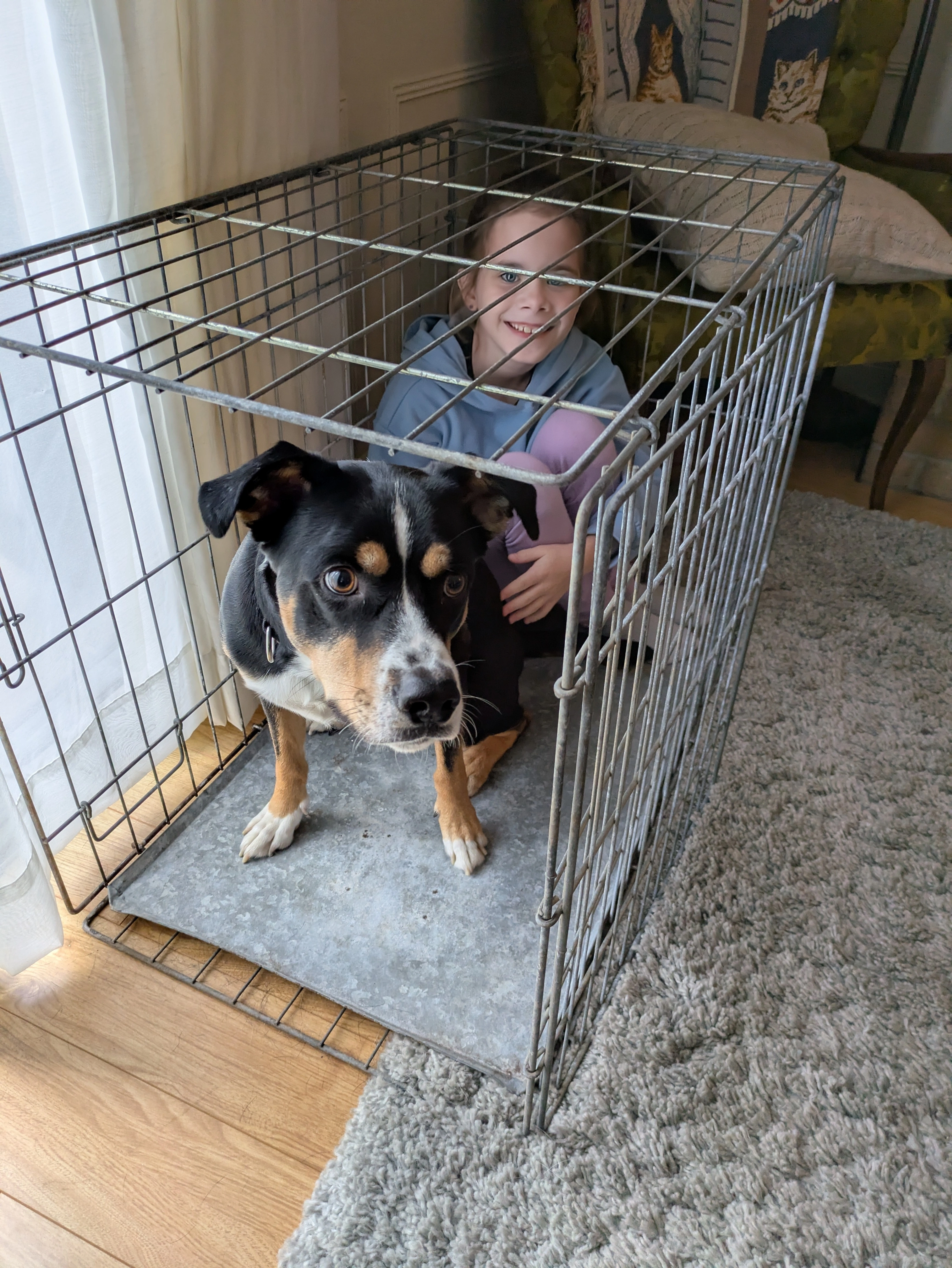 Our 44lb (20kg) puppy has lots of room so the crate would be suitable for a slightly larger or smaller dog (or even naughtyFor kids)! Priced to sell!