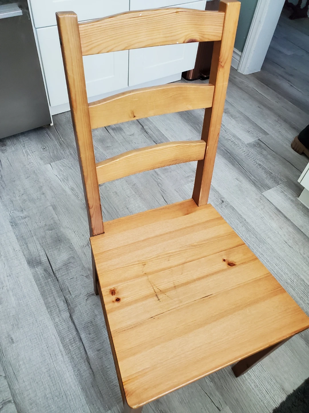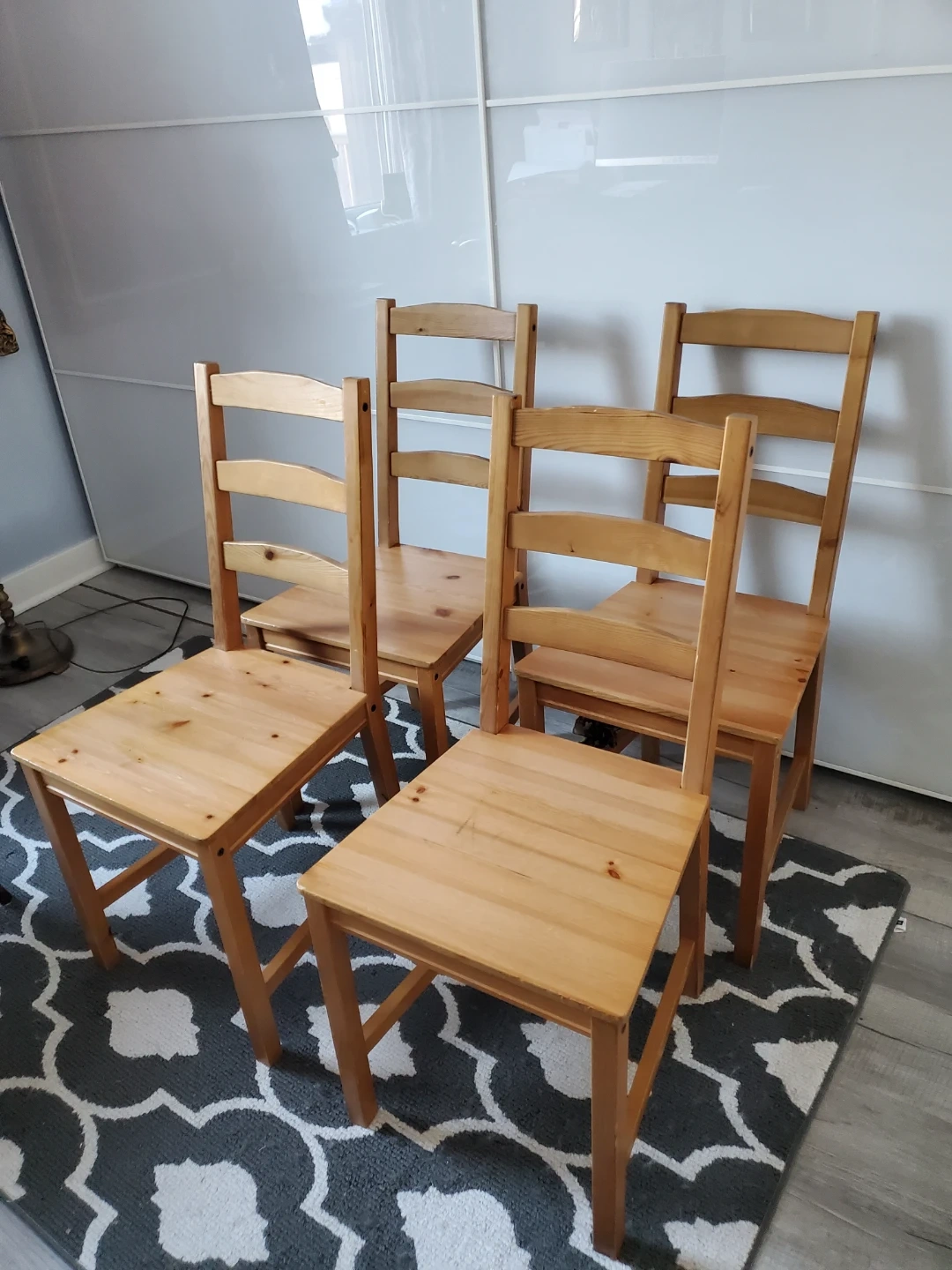 This is a set of four IKEA JOKKMOKK chairs made from solid wood. They have a natural wood finish and a classic design. These chairs are great for a dining table or as extra seating. Mild amount of wear in really great shape