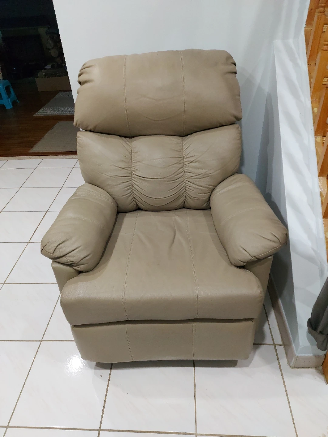 This is a comfy recliner chair in a light brown colour. It's made from a faux leather material and has a padded headrest and armrests. It's a great chair for relaxing after a long day!