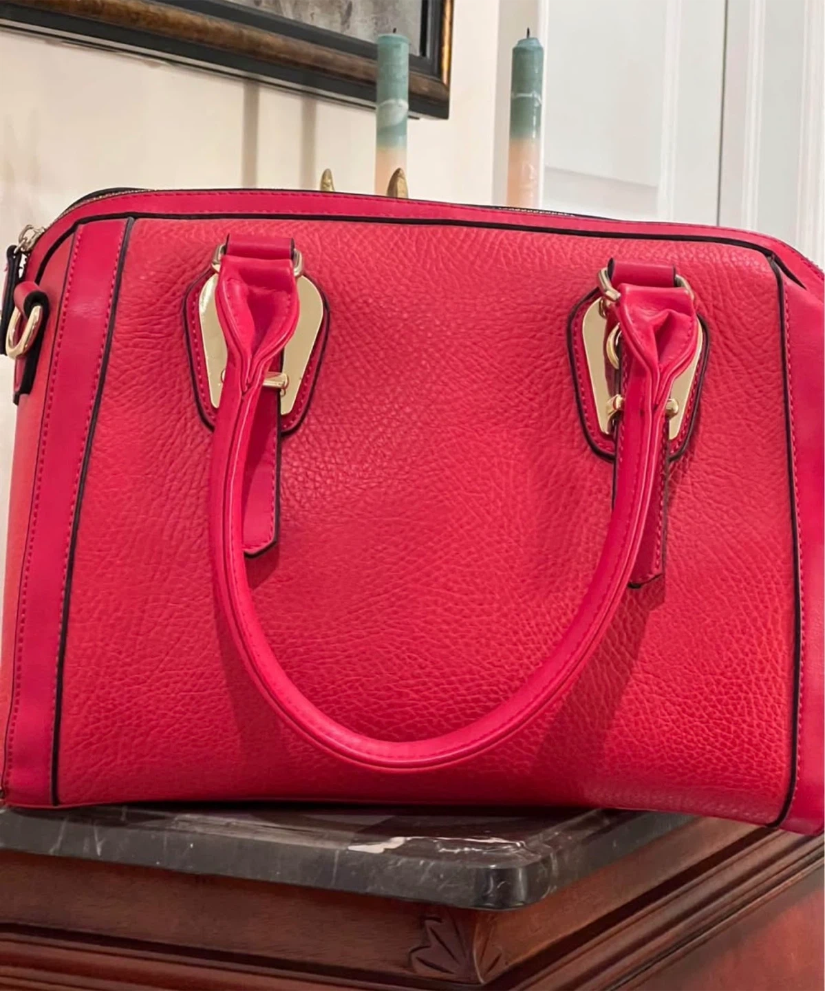 A stylish red satchel handbag with a textured finish. It features comfortable top handles and a zippered closure for security. This bag is great for everyday use or special occasions!
