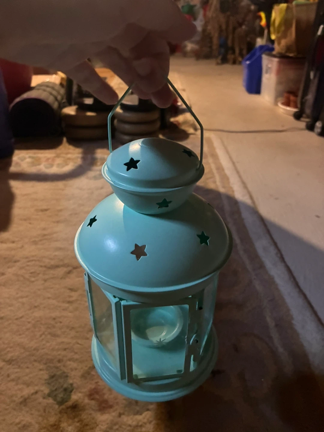 Teal metal lantern with star cutouts. It has glass panels and a metal handle. Perfect for accent lighting or decor!
