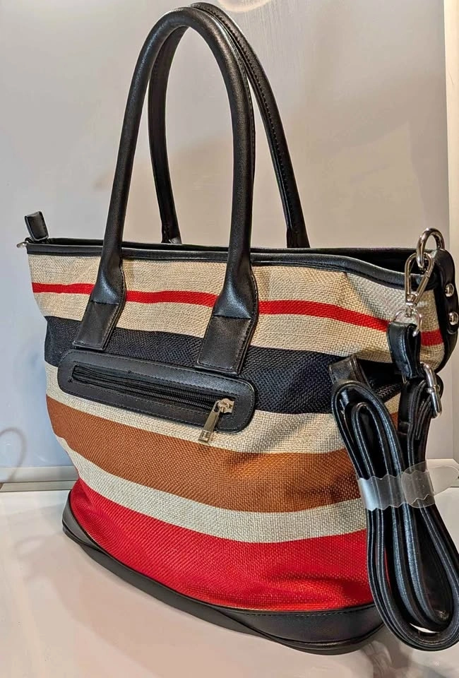 Effortlessly chic and highly functional, this Mia & Luca tote features a bold, earth-toned stripe pattern—ideal for the office, travel, or daily errands.