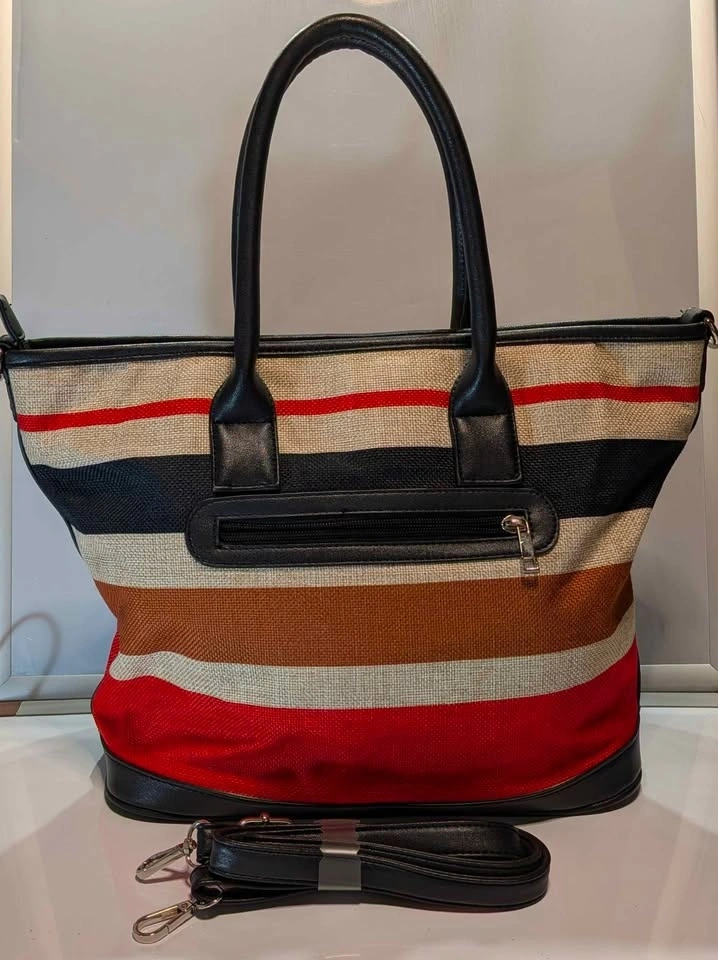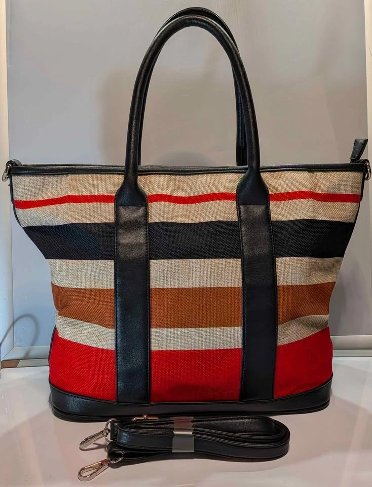 Effortlessly chic and highly functional, this Mia & Luca tote features a bold, earth-toned stripe pattern—ideal for the office, travel, or daily errands.