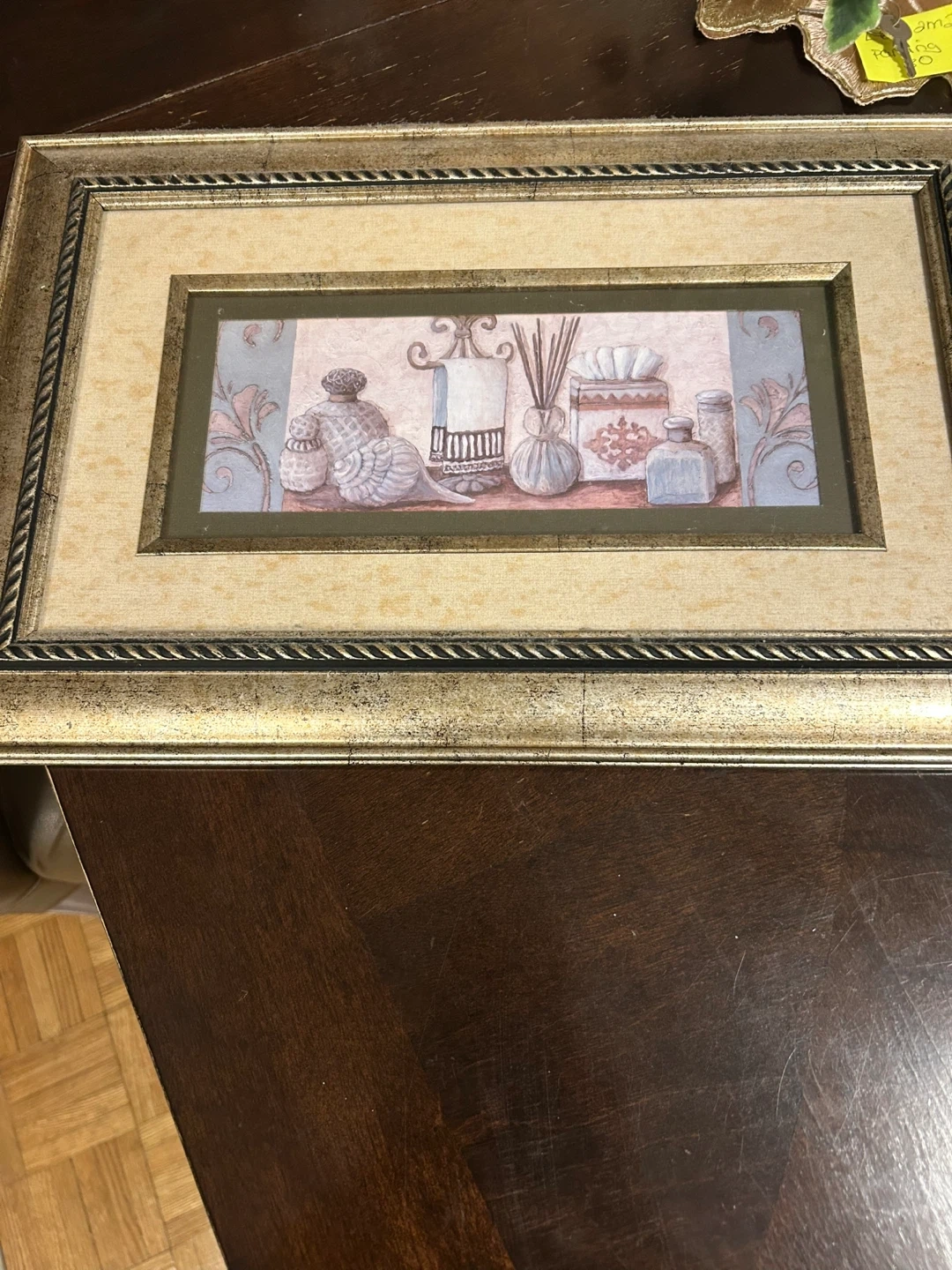 This framed print features a charming watercolour of bathroom essentials. It includes perfume bottles, a tissue box, and aromatic reeds. It's ready to hang and adds a lovely touch to any bathroom!