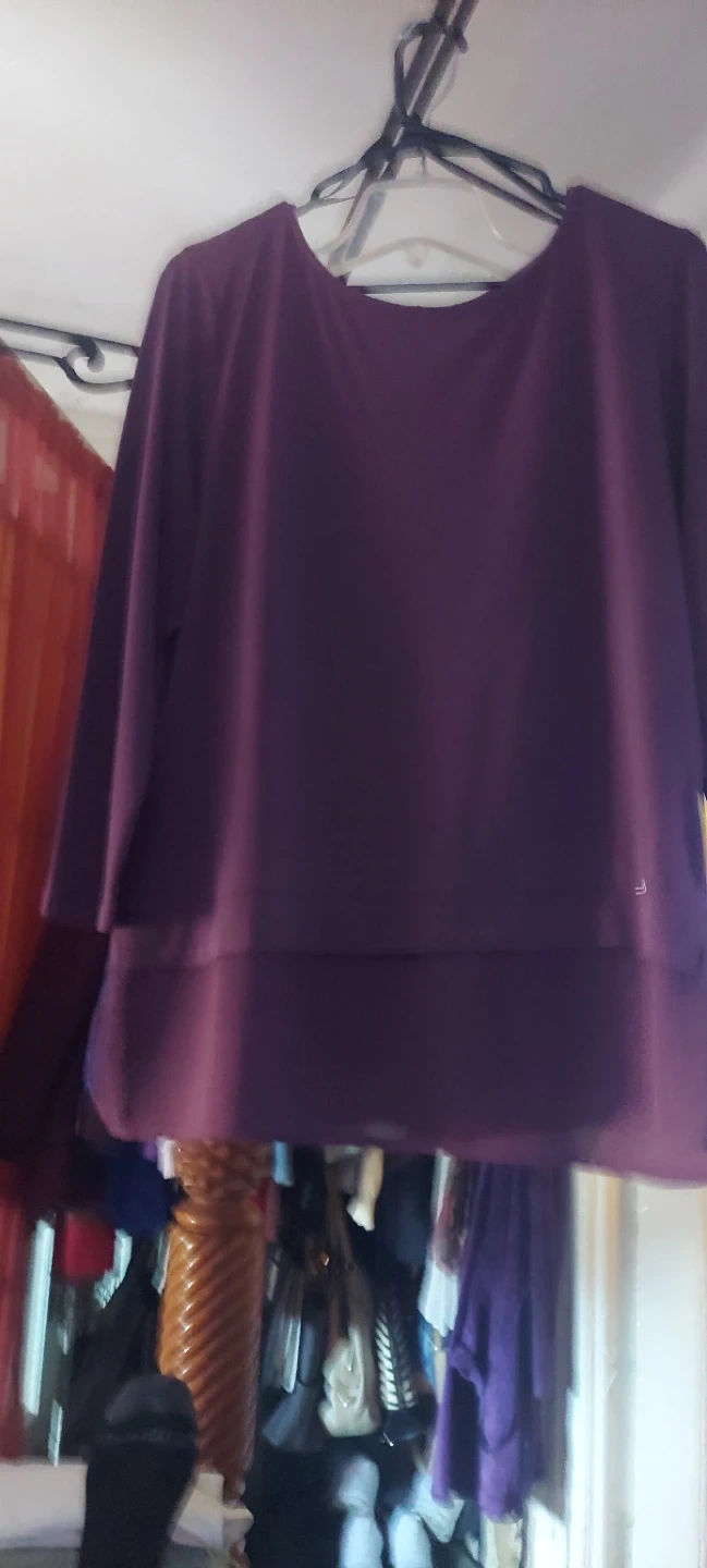 This is a purple, long-sleeved top. It features a layered design. The material is soft and comfortable.
