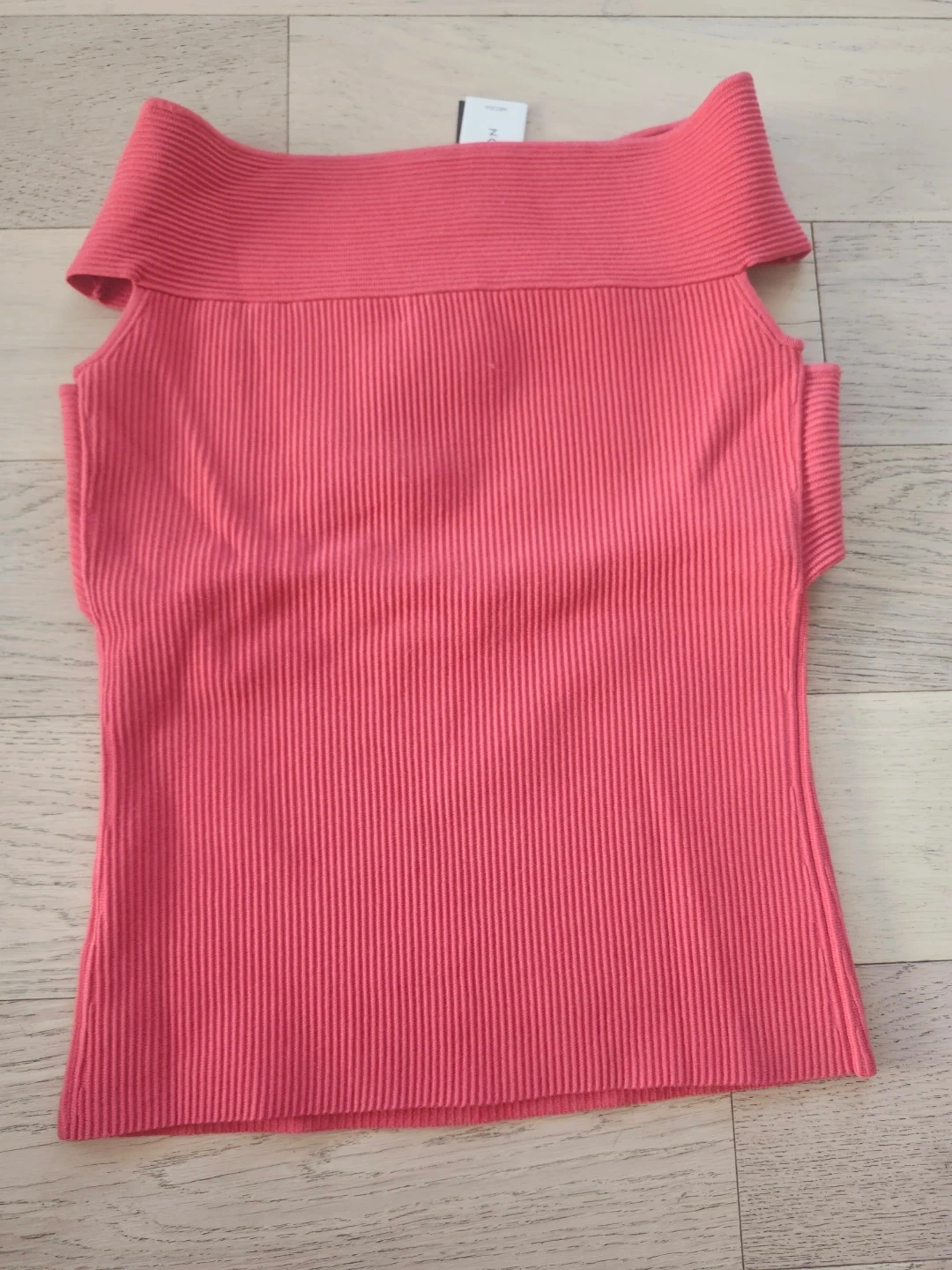 This is a pink ribbed off-the-shoulder top from Babaton. It's a size medium. The material is a stretchy knit. Retails for $78