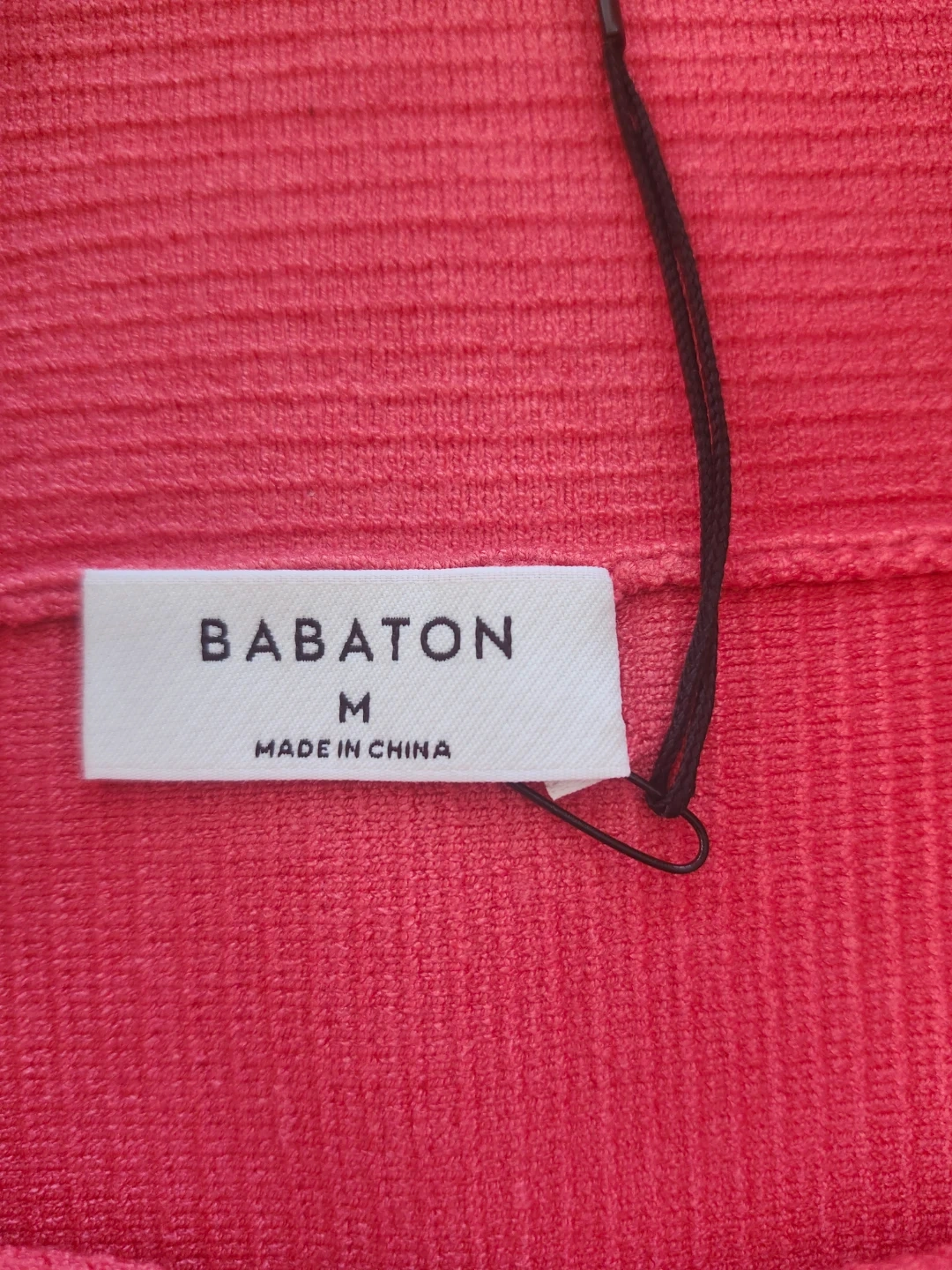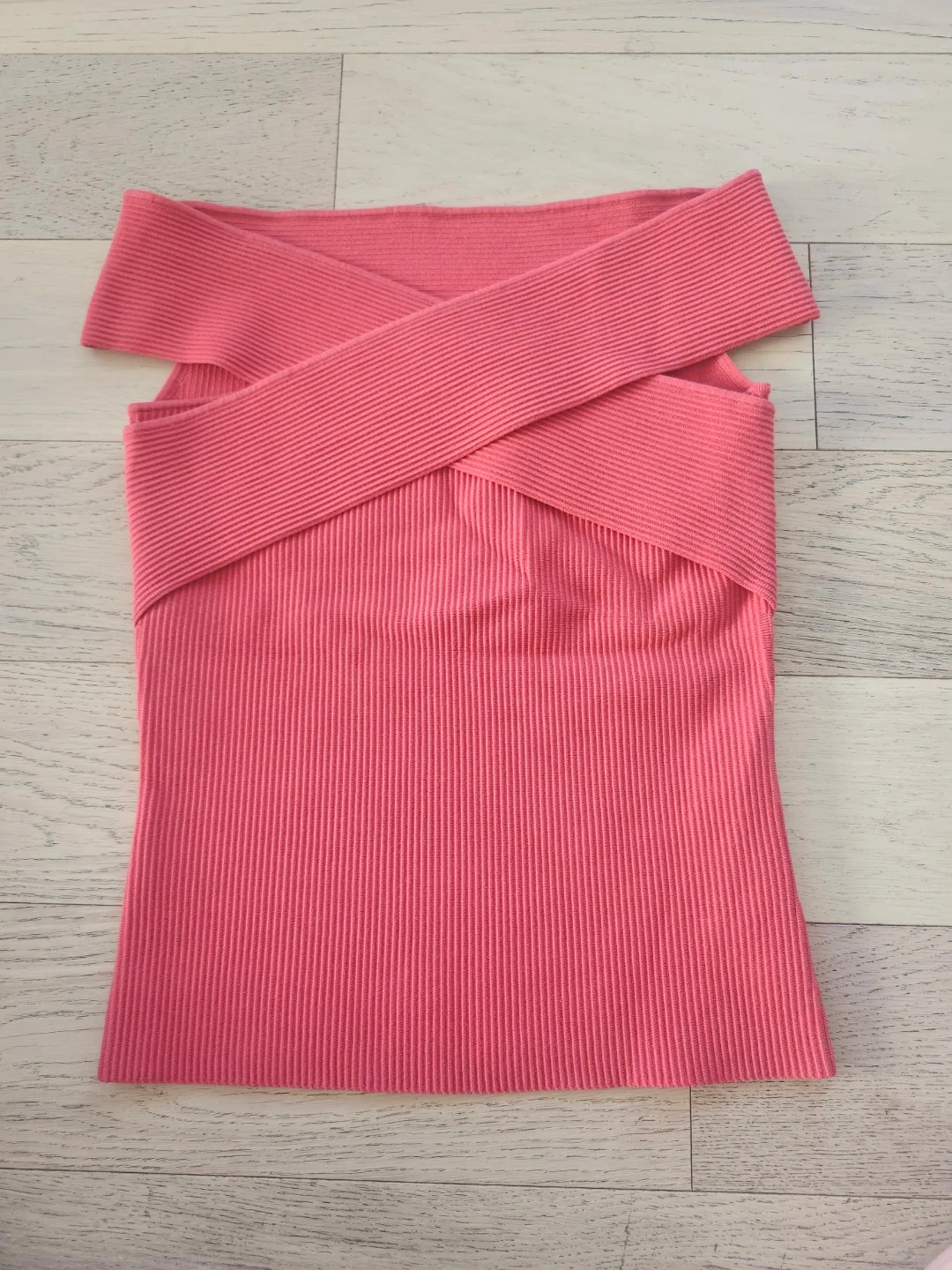 This is a pink ribbed off-the-shoulder top from Babaton. It's a size medium. The material is a stretchy knit. Retails for $78