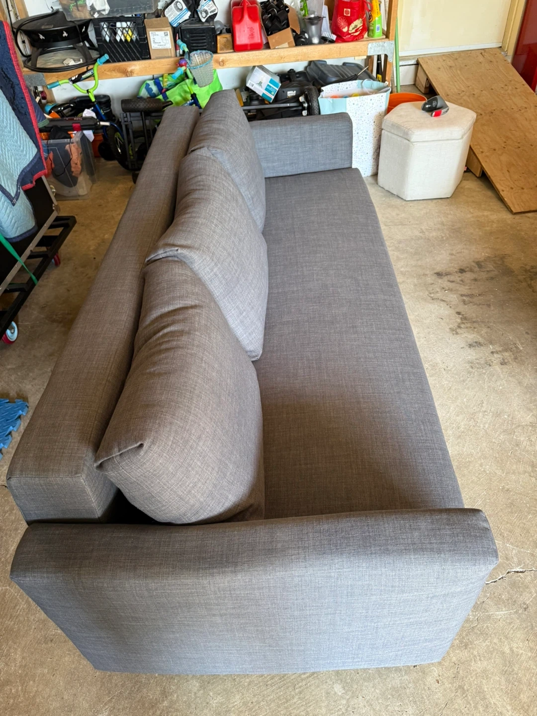 Grey Ikea Friheten Sofabed. It features hidden storage underneath the seat cushions. The sofa easily converts into a flat sleeping surface.