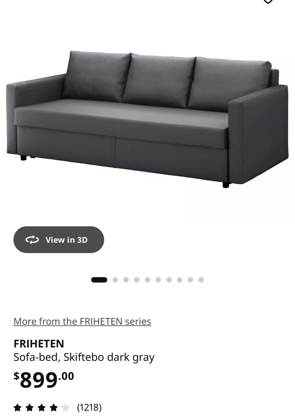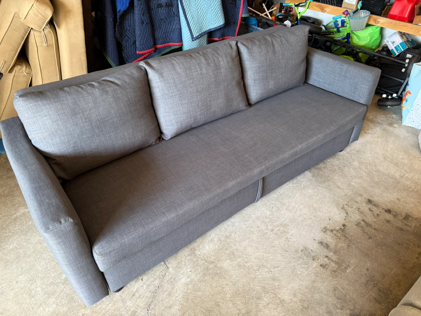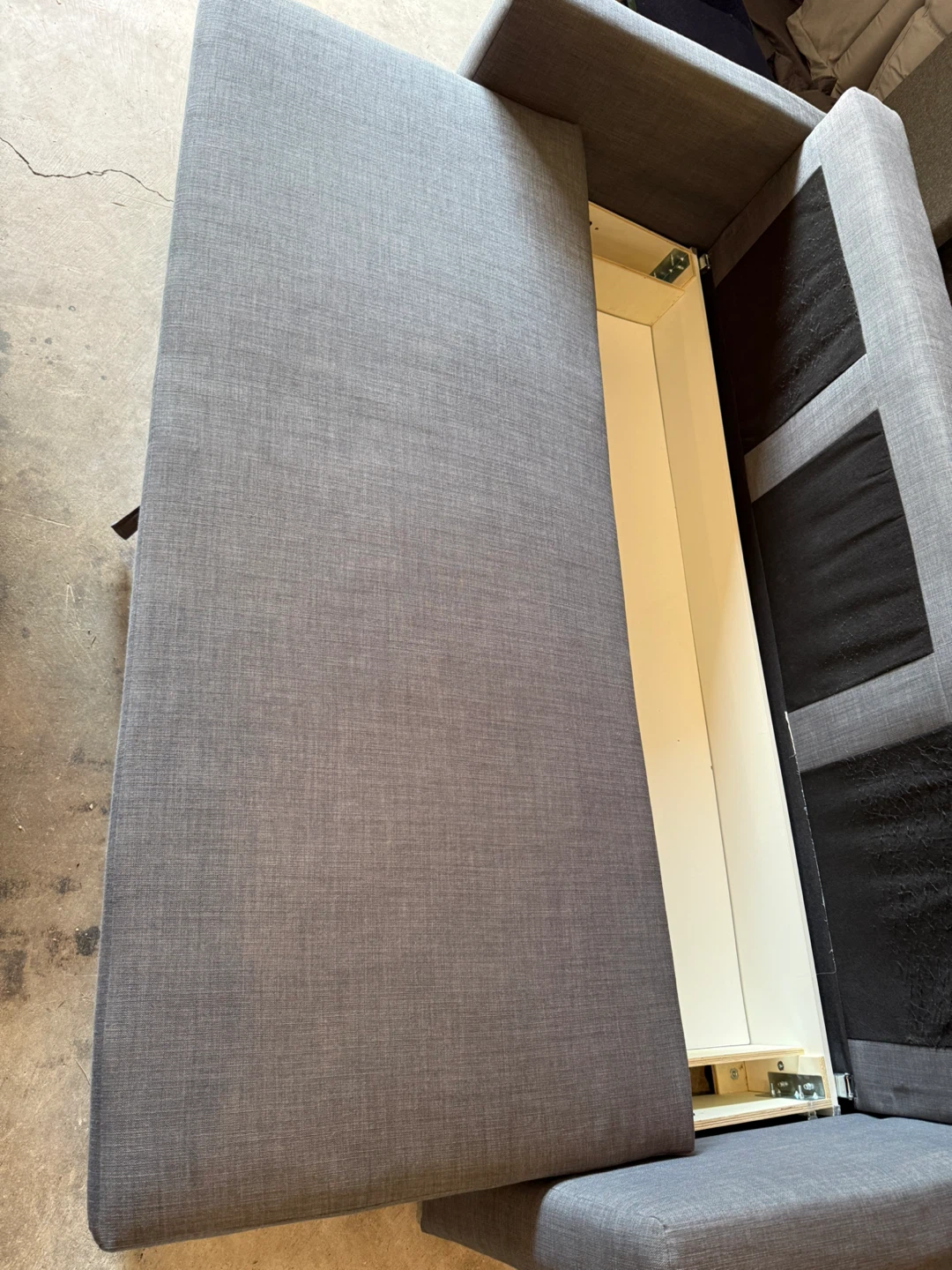 Grey Ikea Friheten Sofabed. It features hidden storage underneath the seat cushions. The sofa easily converts into a flat sleeping surface.