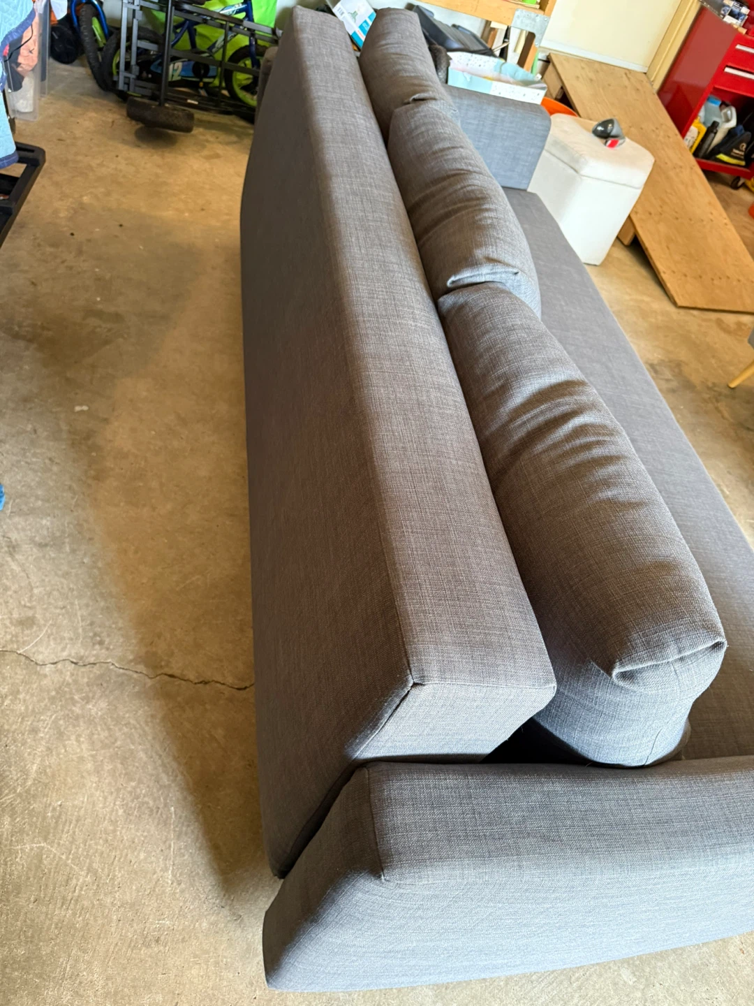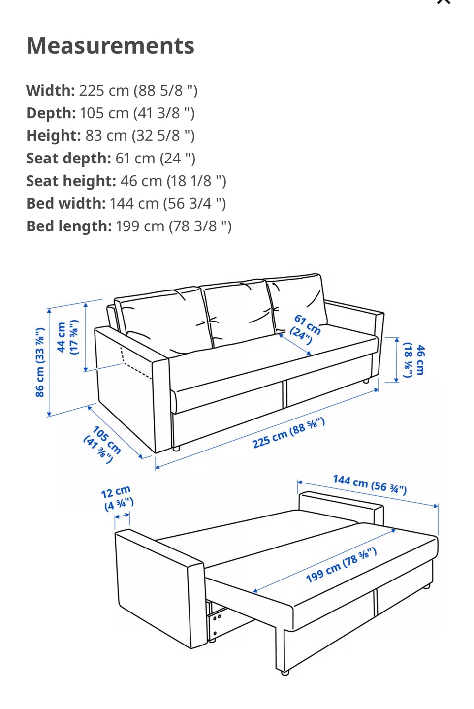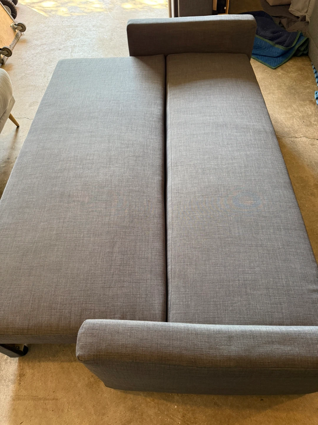 Grey Ikea Friheten Sofabed. It features hidden storage underneath the seat cushions. The sofa easily converts into a flat sleeping surface.
