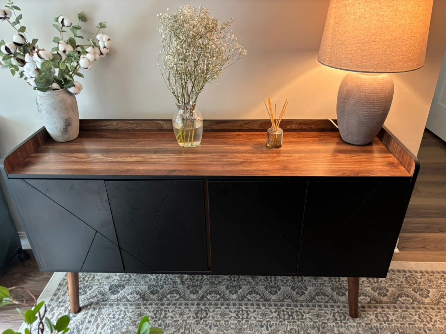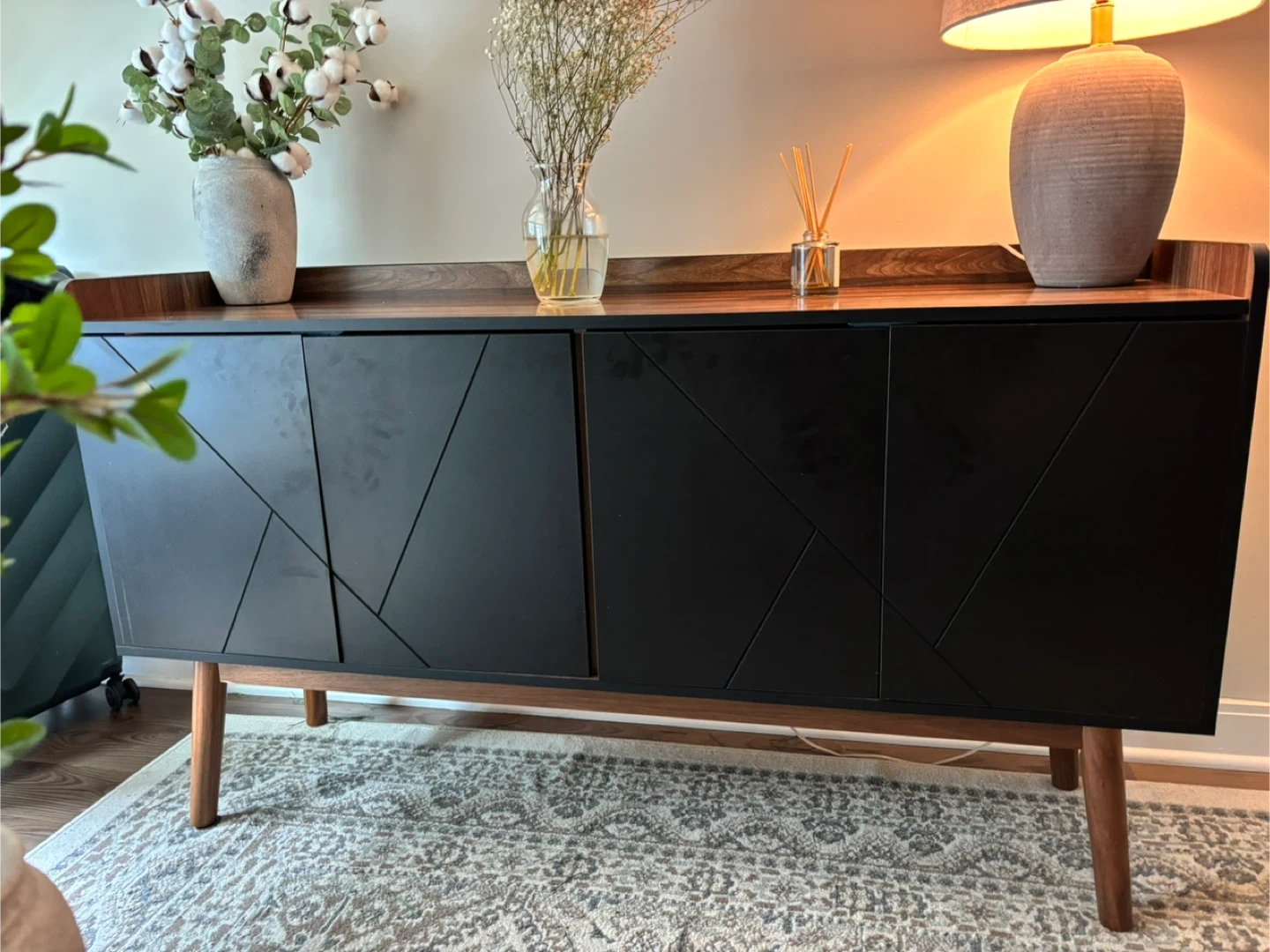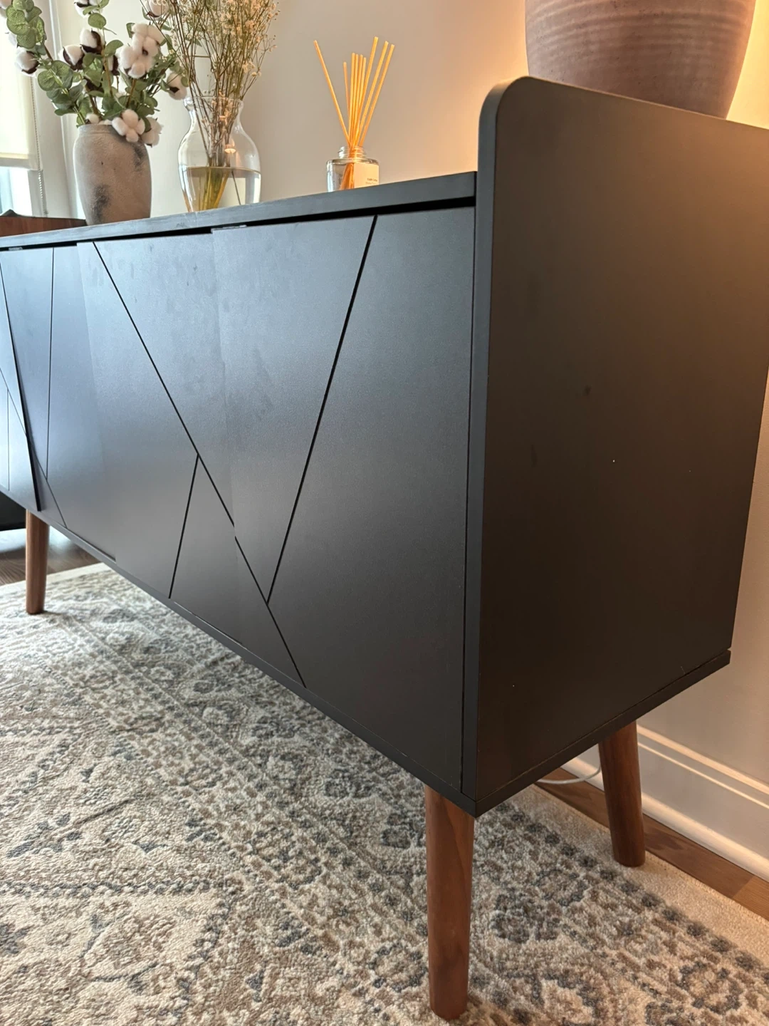 This sideboard features a sleek black finish with a modern geometric door design. It has a warm wood-grain top and tapered wooden legs. Plenty of storage behind the four doors!