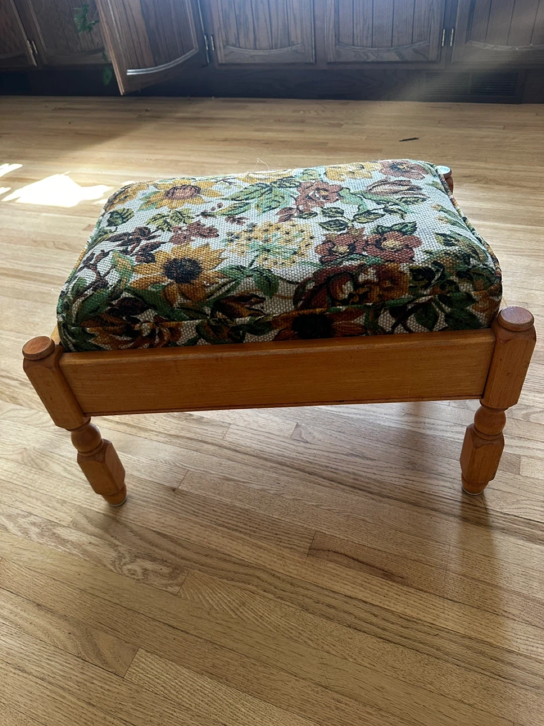 Here's a cute floral upholstered ottoman footstool! It has a wooden frame and legs. The cushion is covered in a beautiful floral pattern with sunflowers and other flowers. It's in good condition and ready for a new home, you can put it beside your door when you change your shoes or when you sit beside your kids accompanying with them.