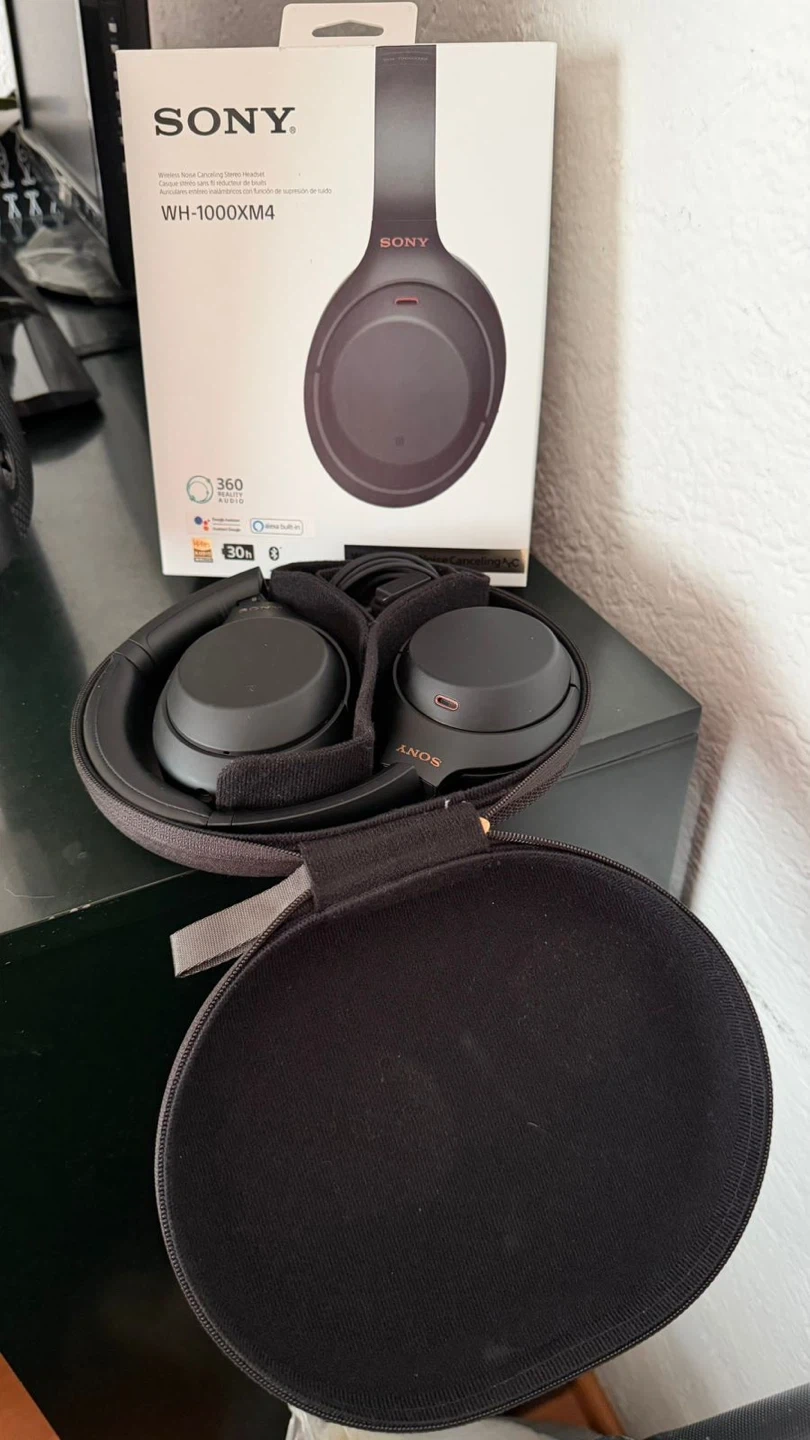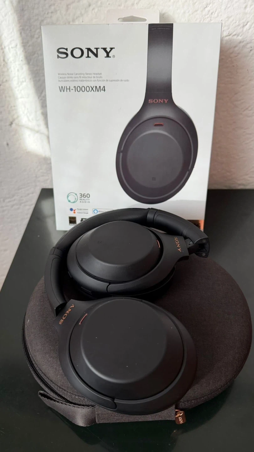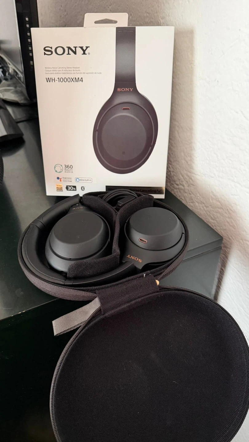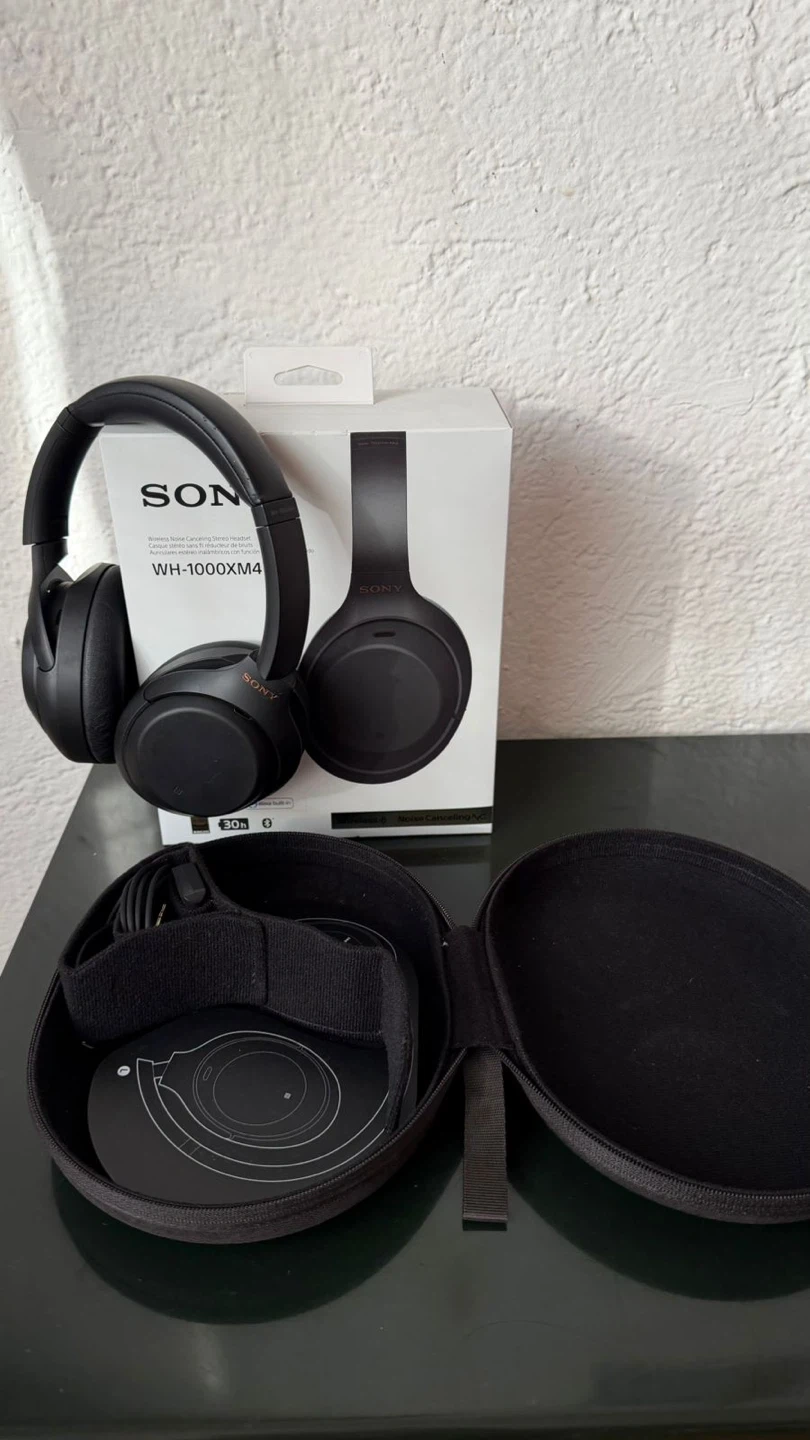 These are the Sony WH-1000XM4 wireless noise-cancelling headphones in black. They offer 30 hours of battery life and include a carrying case. Great for travel or daily use!