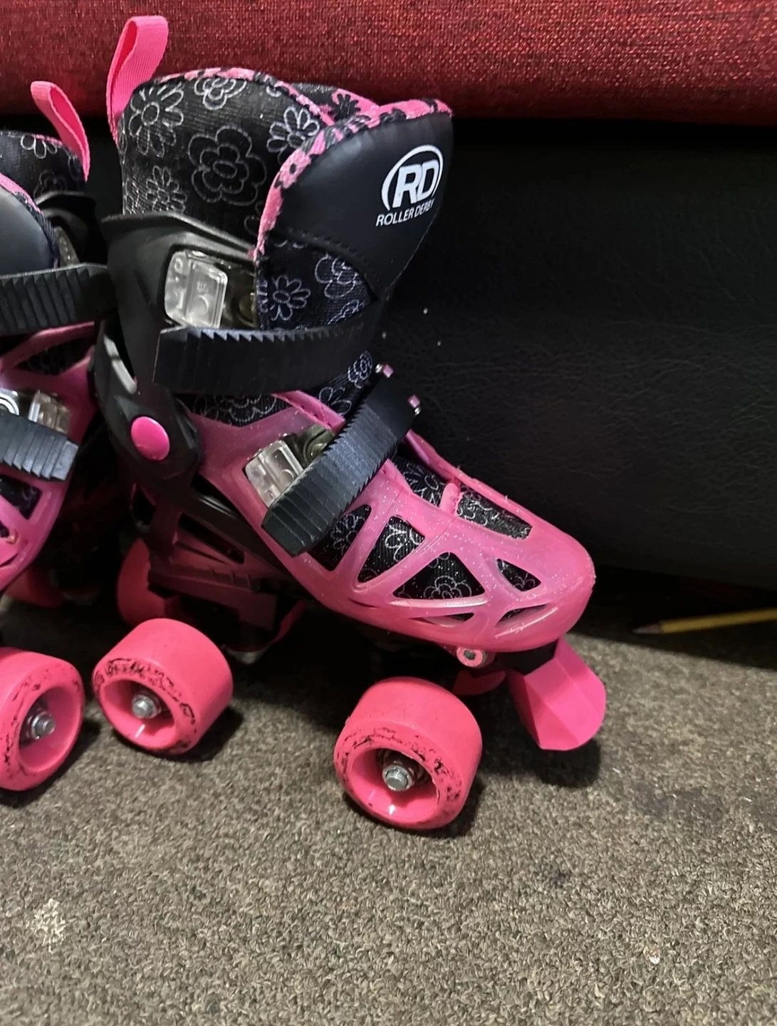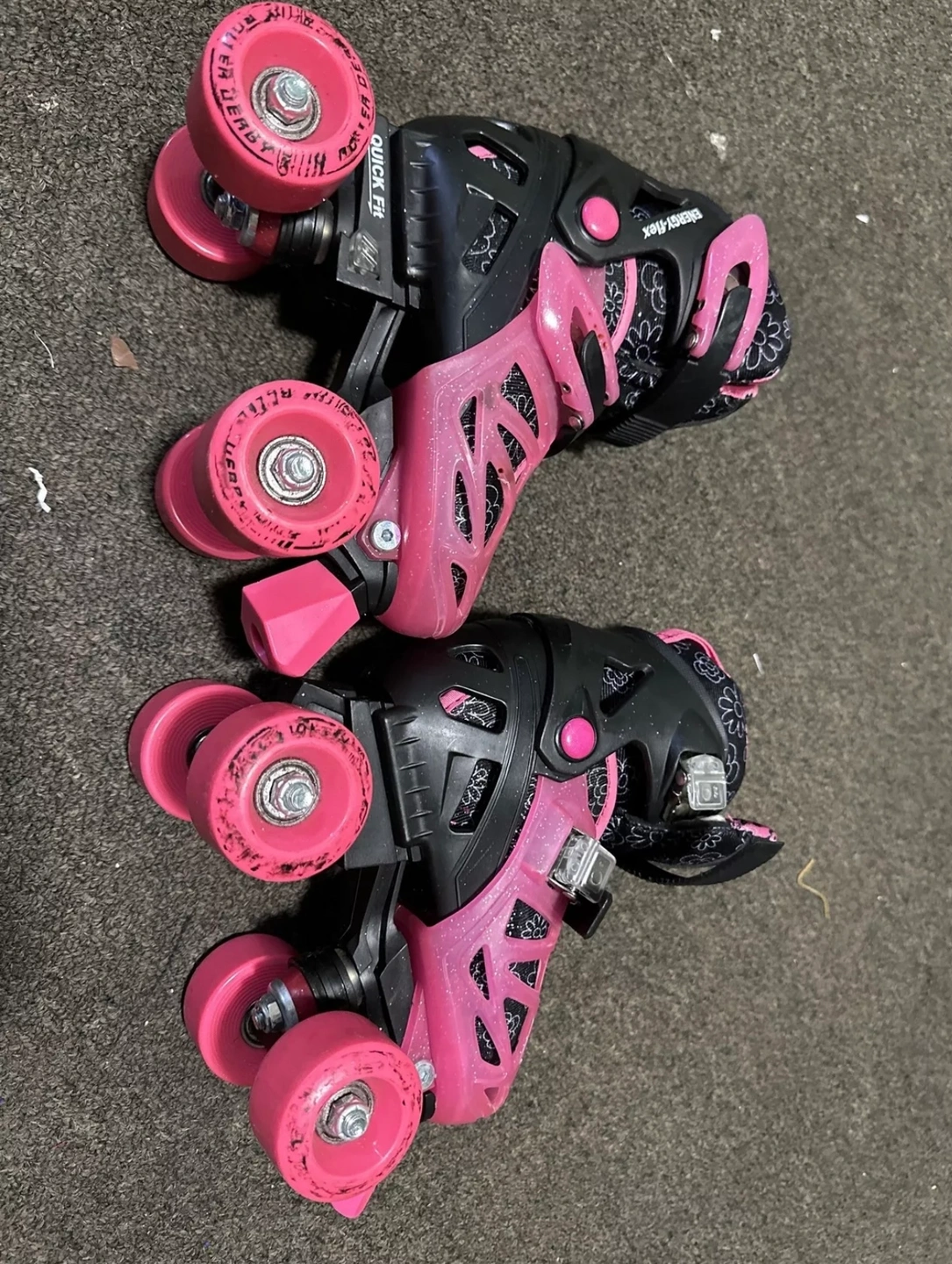 Pink and black roller skates. These skates are for kids. They are adjustable in size. They have flower patterns. They have a quick-release buckle. They are in good condition.