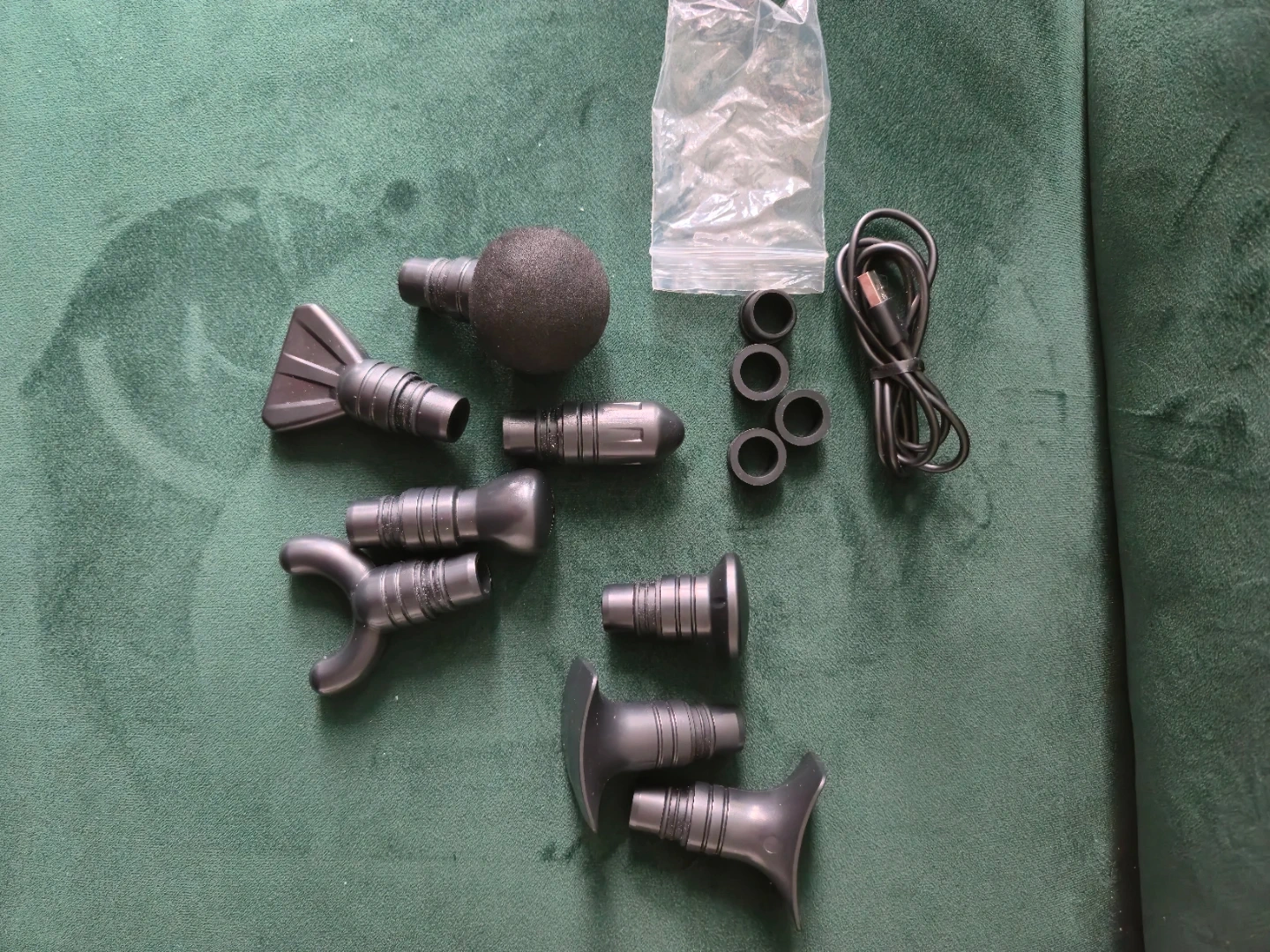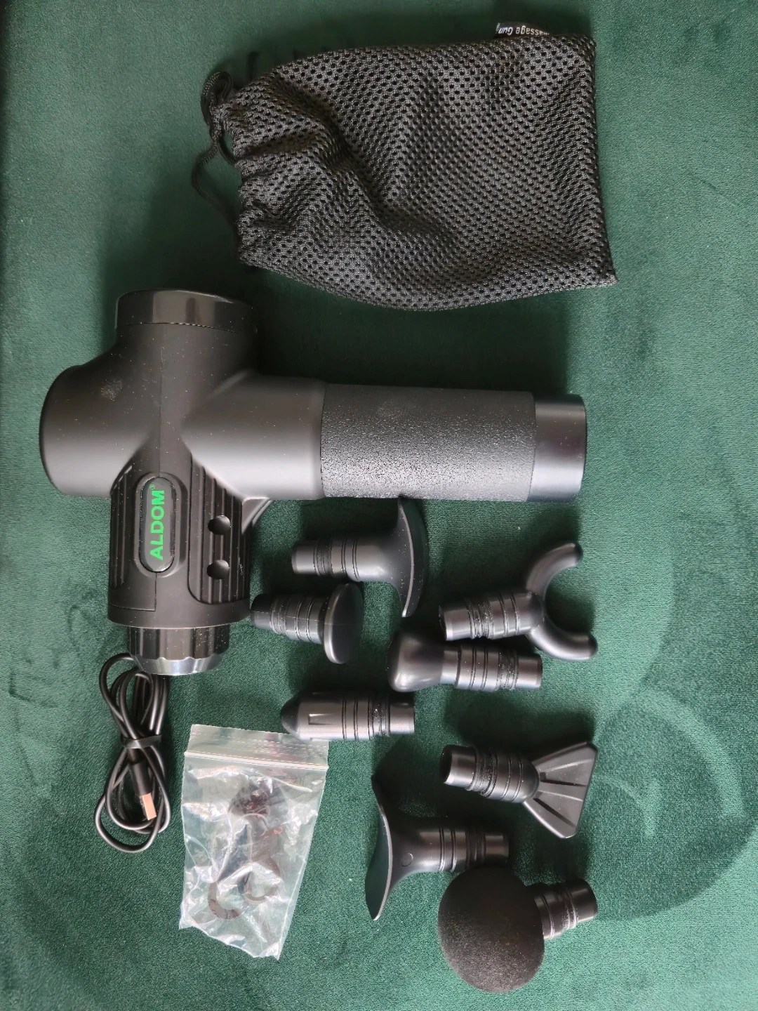 Aldom deep tissue massage gun with multiple massage heads included. It comes with a carrying case and USB charging cable. This percussion massager helps with muscle relief.