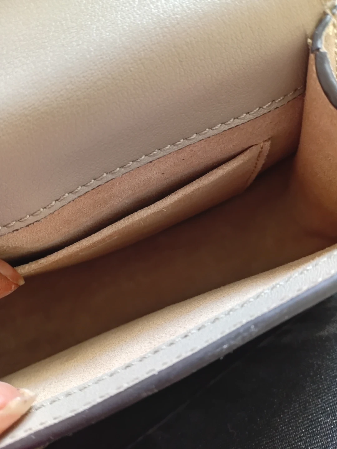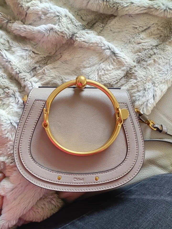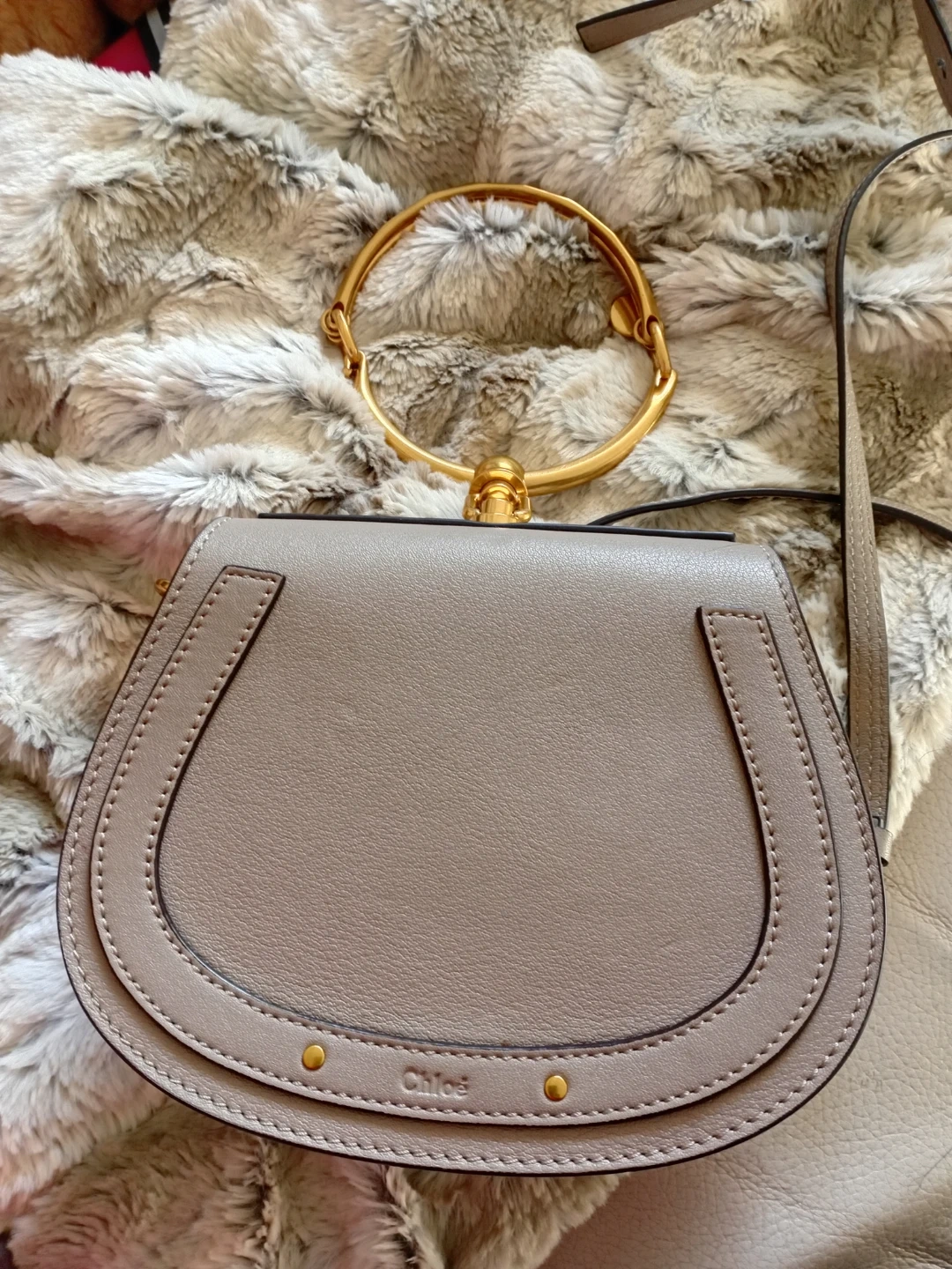 Here's a stylish grey leather handbag from Chloé. It features a unique gold-tone metal handle. The bag is in great condition and ready for a new owner!
