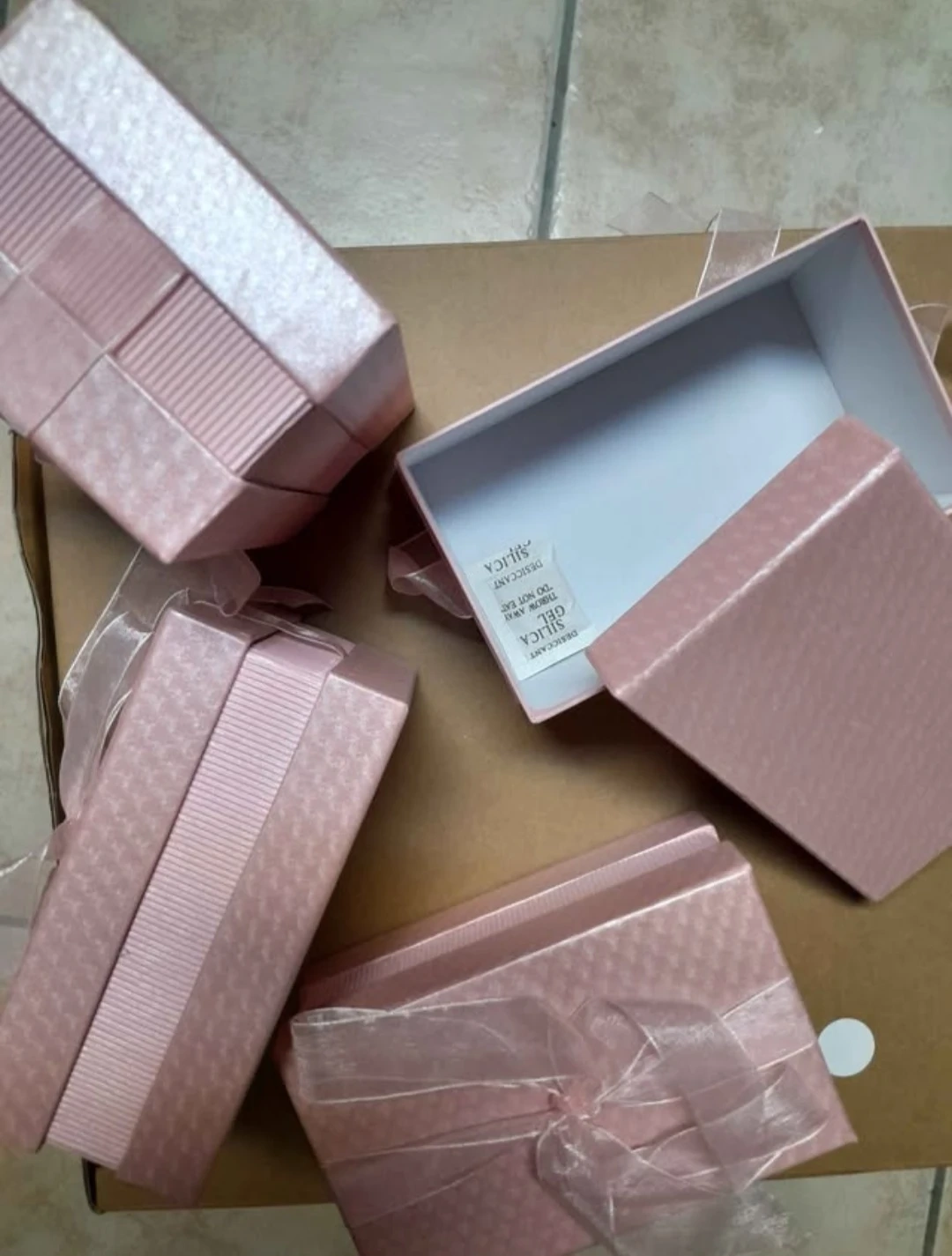 A collection of pretty pink gift boxes, with a delicate ribbon.