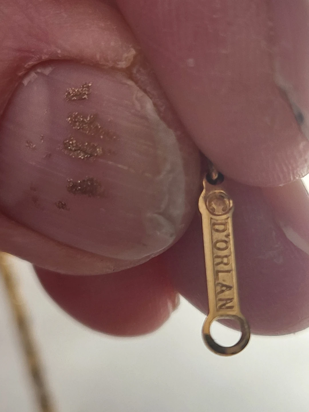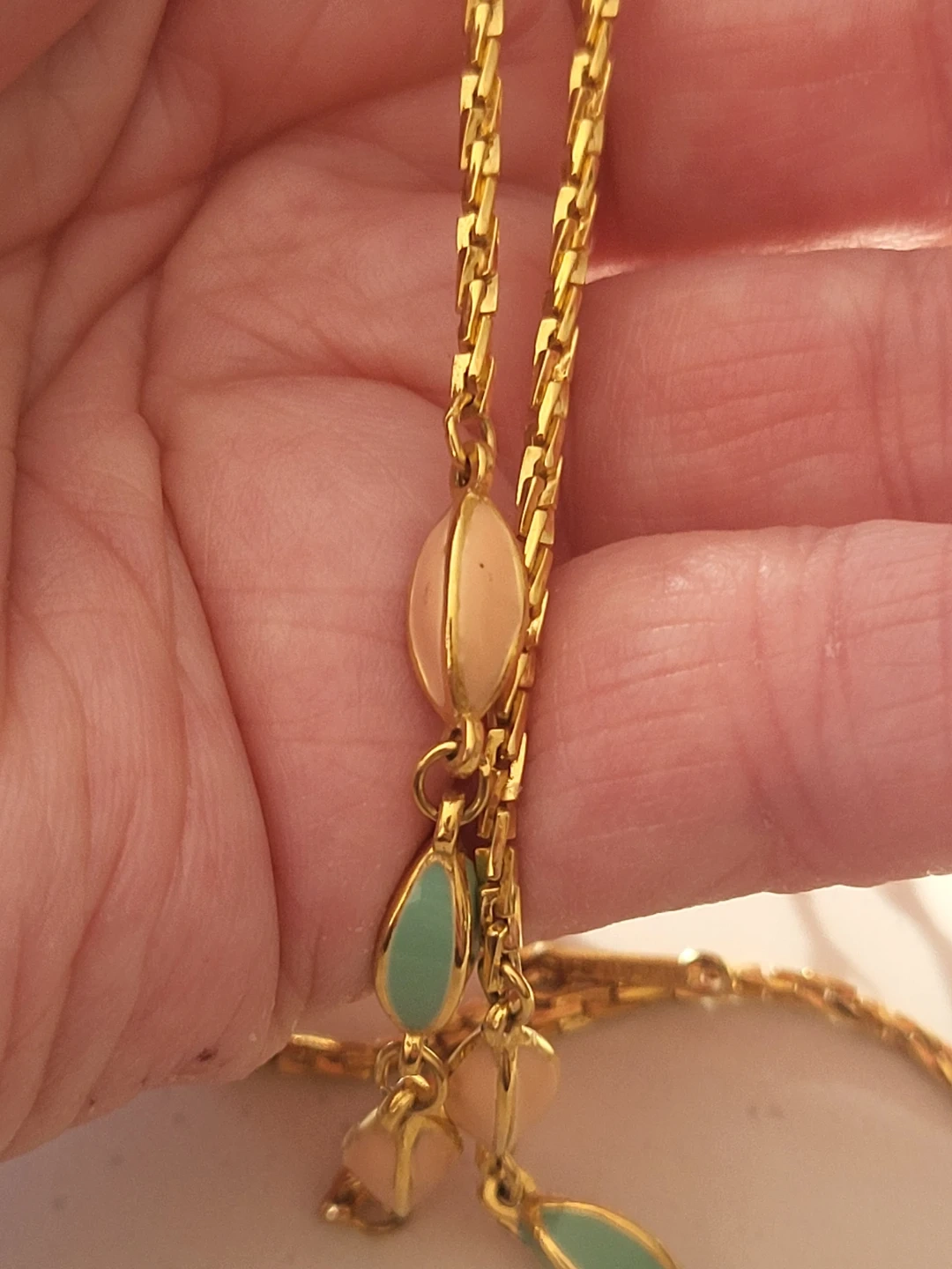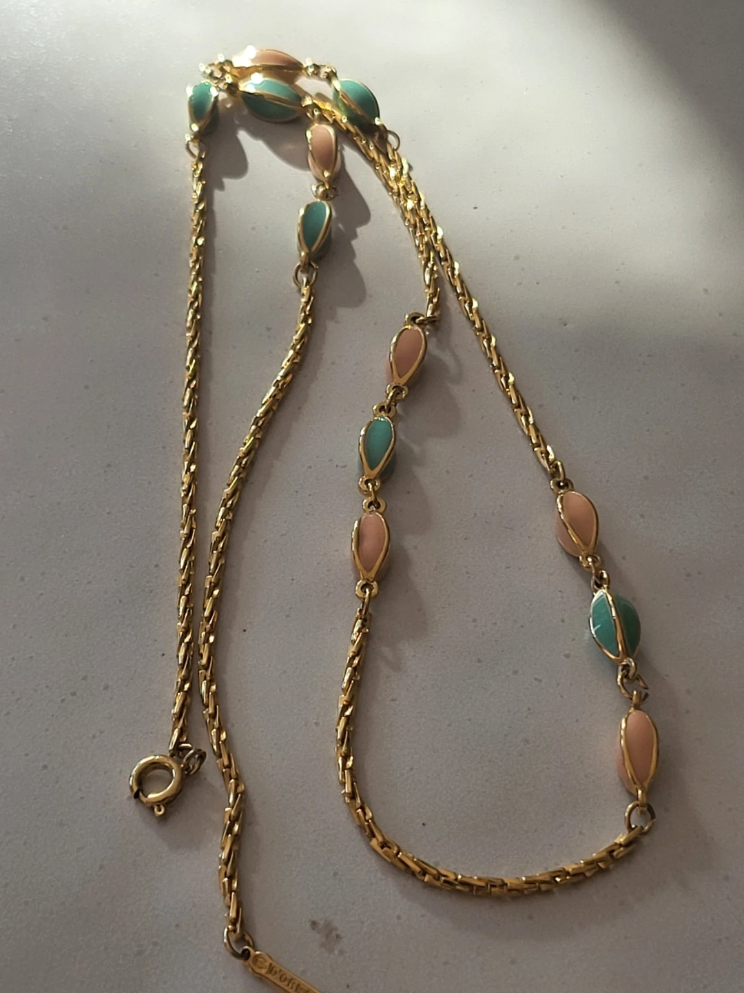 D'Orlan necklace with gold tone chain. It features alternating peach and teal coloured marquise-shaped beads. Clasp closure. A classic accessory!
