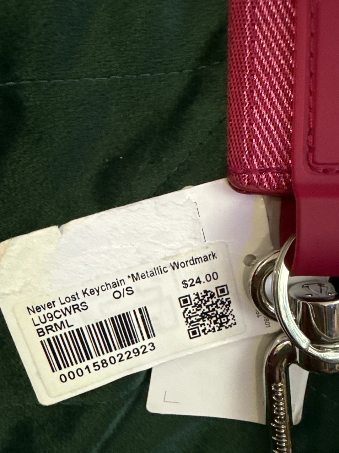 This is a Lululemon Never Lost Keychain with a Metallic Wordmark design. It's O/S and features a sturdy metal clasp. It's a great way to keep your keys accessible!