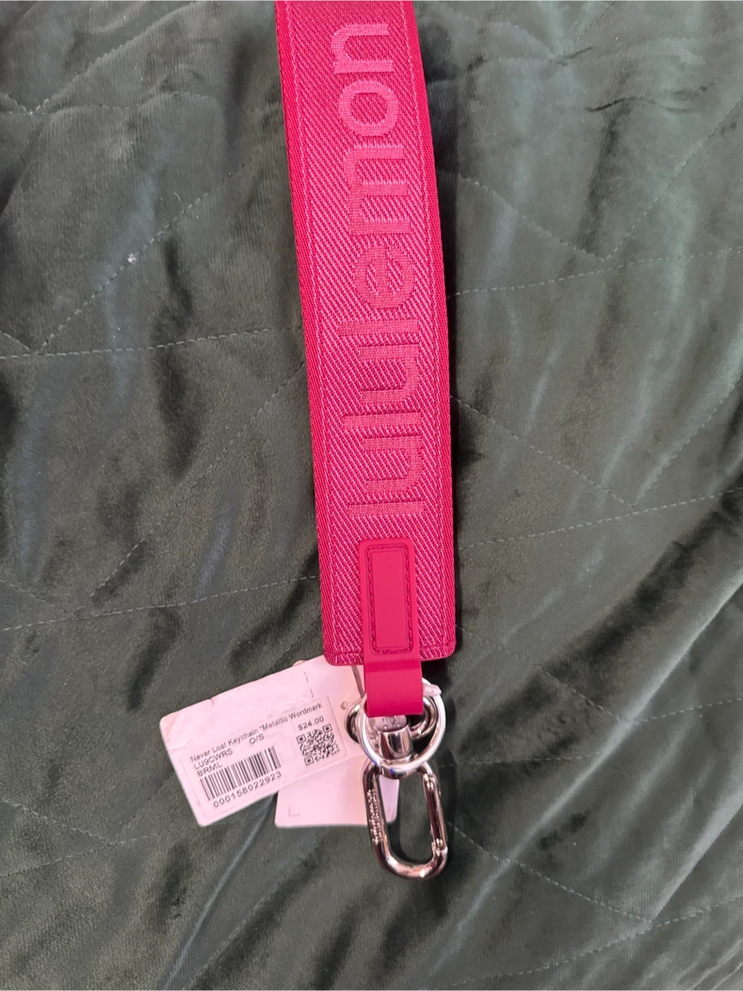 This is a Lululemon Never Lost Keychain with a Metallic Wordmark design. It's O/S and features a sturdy metal clasp. It's a great way to keep your keys accessible!