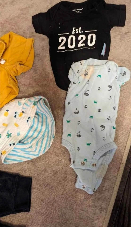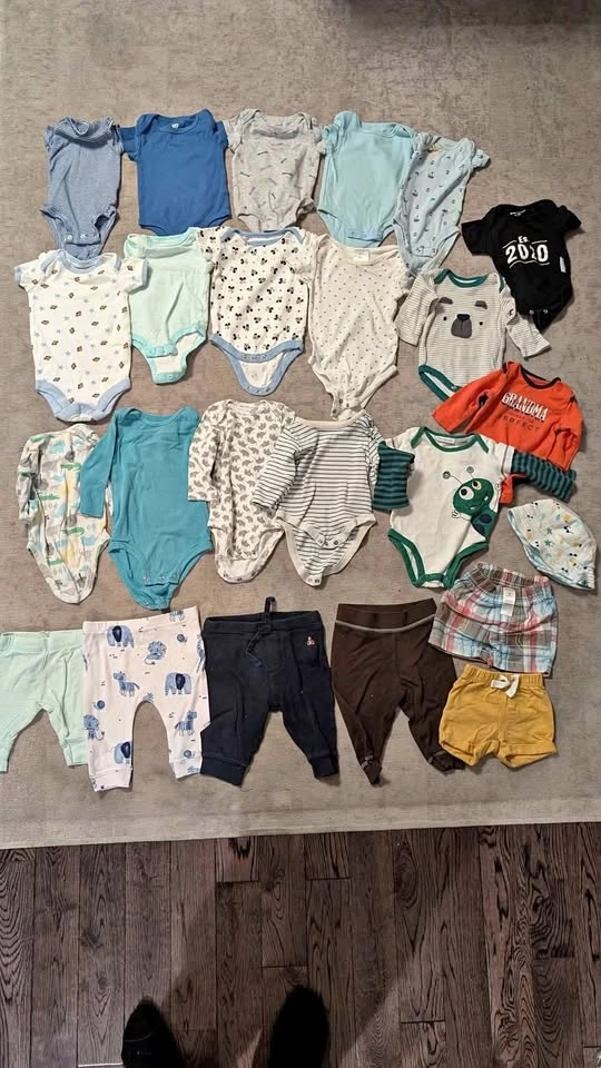 Baby boy clothes bundle. 24 pieces total. 22 pieces are in excellent condition, with one outdated 2020 onesie and one stained onesie (see last photo). Sizes are newborn to 3-6 months. Please see photos for specific sizes and brands. I have many other baby clothes available for boys, girls, and gender-neutral options in sizes 0-18 months, including sleepers, seasonal outfits, onesies, pants, dresses, and sweaters. Check out my other listings! I also have brand new with tags baby clothes in various sizes, perfect for gifts. Located near Greenwood and Danforth area.