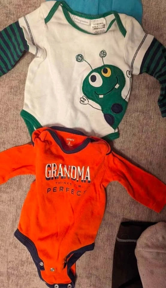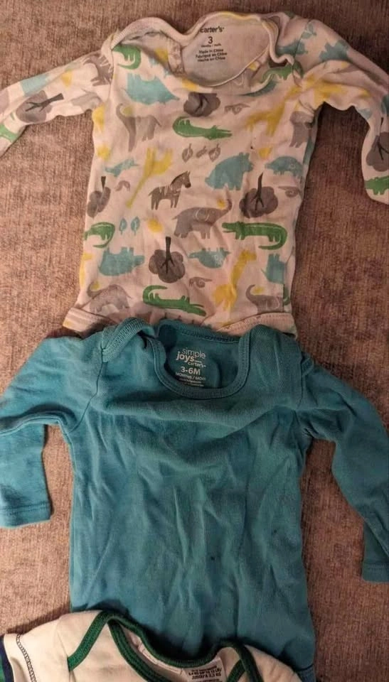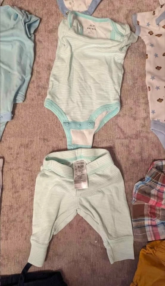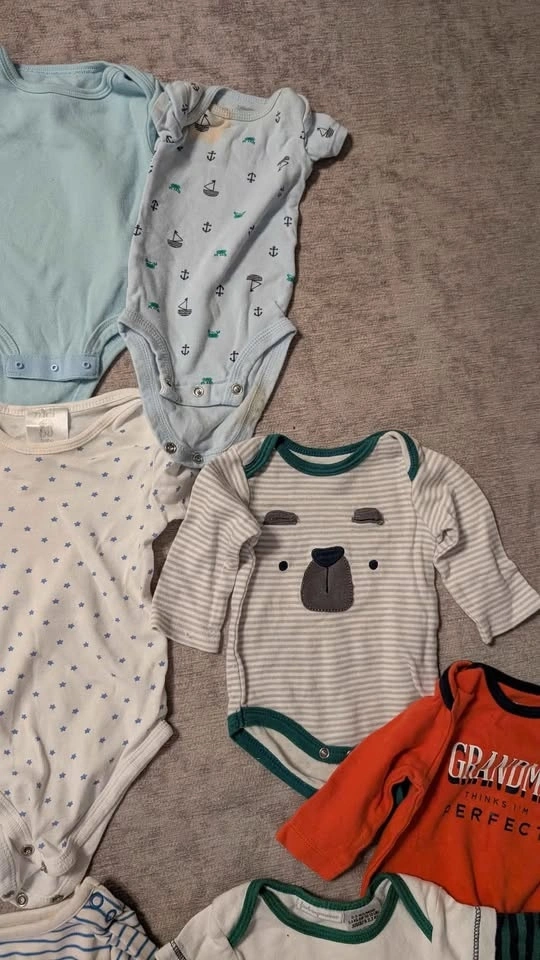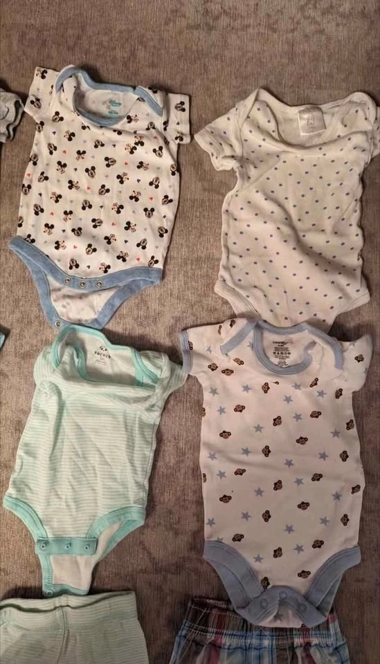 Baby boy clothes bundle. 24 pieces total. 22 pieces are in excellent condition, with one outdated 2020 onesie and one stained onesie (see last photo). Sizes are newborn to 3-6 months. Please see photos for specific sizes and brands. I have many other baby clothes available for boys, girls, and gender-neutral options in sizes 0-18 months, including sleepers, seasonal outfits, onesies, pants, dresses, and sweaters. Check out my other listings! I also have brand new with tags baby clothes in various sizes, perfect for gifts. Located near Greenwood and Danforth area.