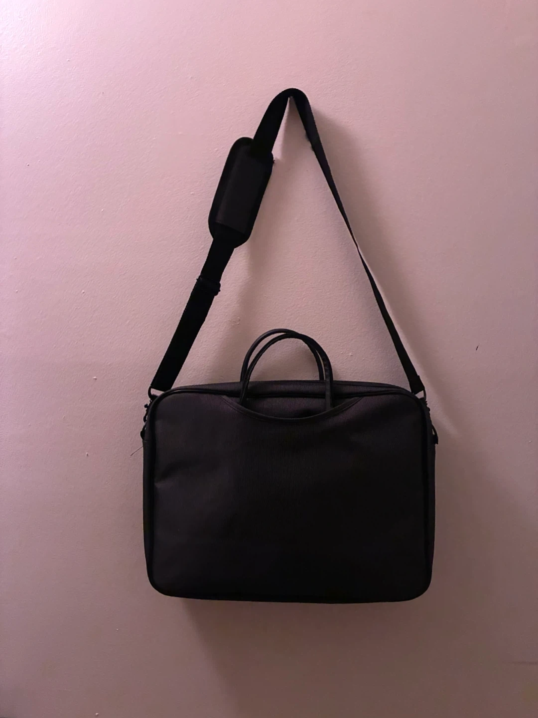This black briefcase is designed for carrying a laptop and accessories. It features a durable exterior with dual top handles and an adjustable, detachable shoulder strap for comfortable transport. The interior offers ample space for your essentials.