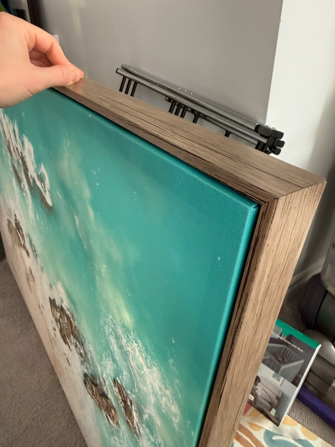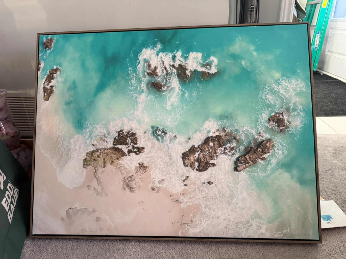 Canvas print featuring a beautiful aerial view of ocean waves crashing on a sandy beach with rocks. It's framed in a wood-look composite material, ready to hang and add a coastal vibe to any room! This piece is perfect for bringing a bit of the tropics indoors.