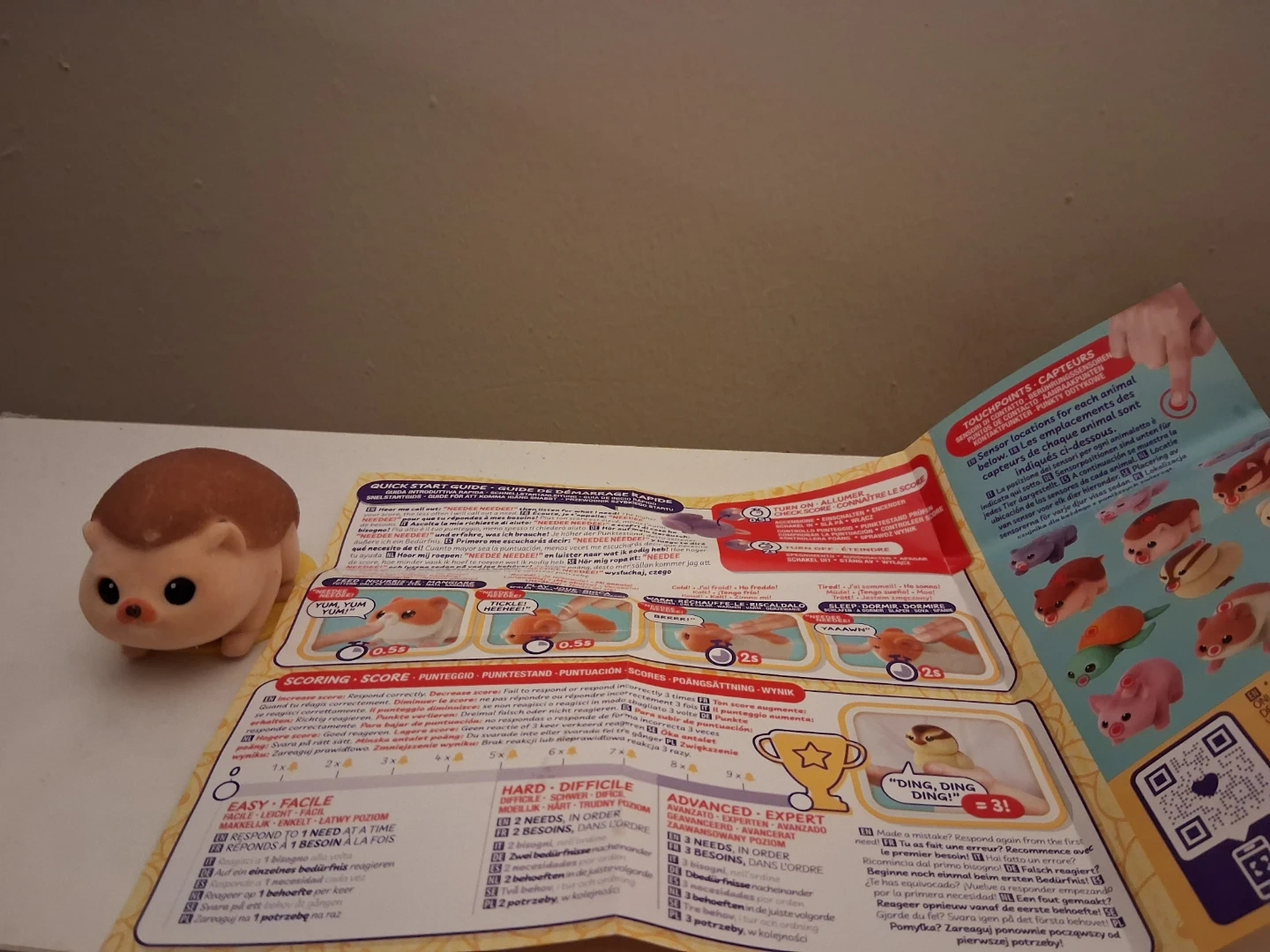 This is a Needeez interactive hedgehog toy! It responds to touch and sound. It needs 1 to 3 needs in order. It's easy to hard to advanced/expert!