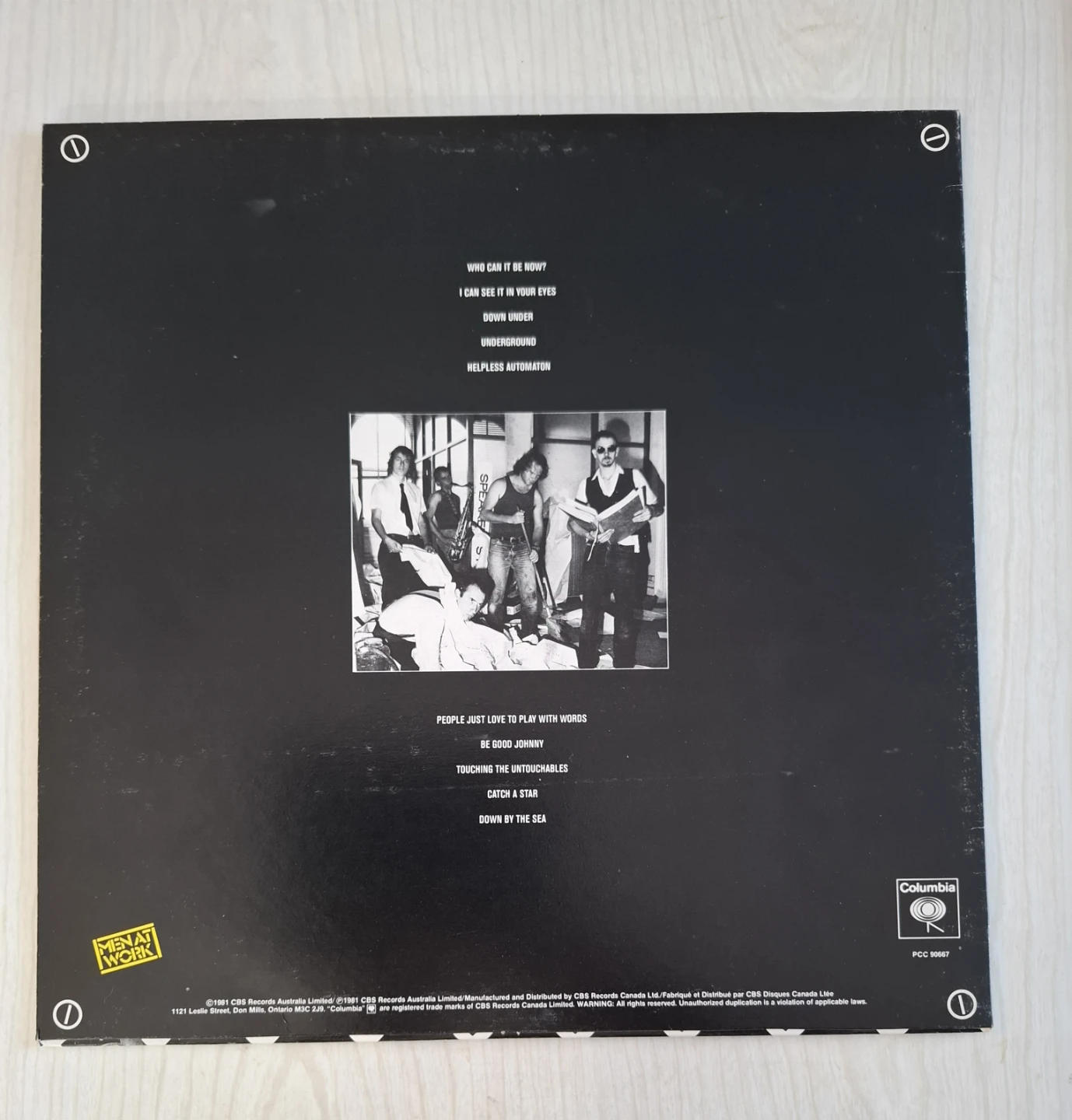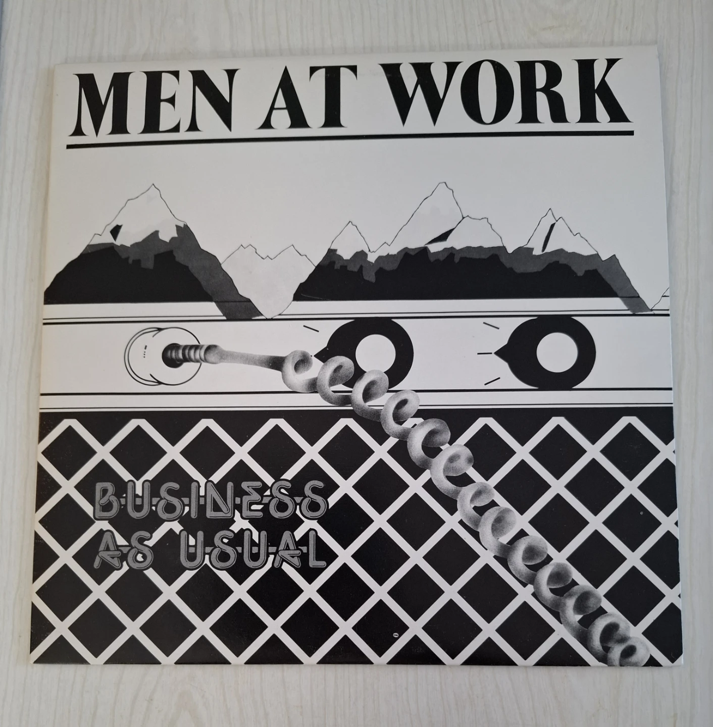 This is the "Business As Usual" vinyl record by Men At Work. It includes tracks like "Who Can It Be Now?" and "Down Under". This album was released in 1981.