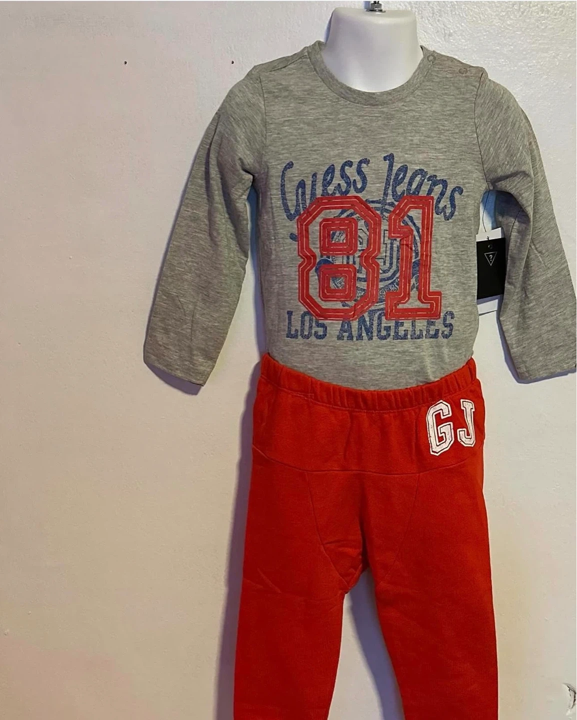 This toddler set includes a grey long-sleeved t-shirt with "Guess Jeans 81 Los Angeles" graphic and red sweatpants with "GJ" logo. Cotton blend material for comfort. Great for casual wear!