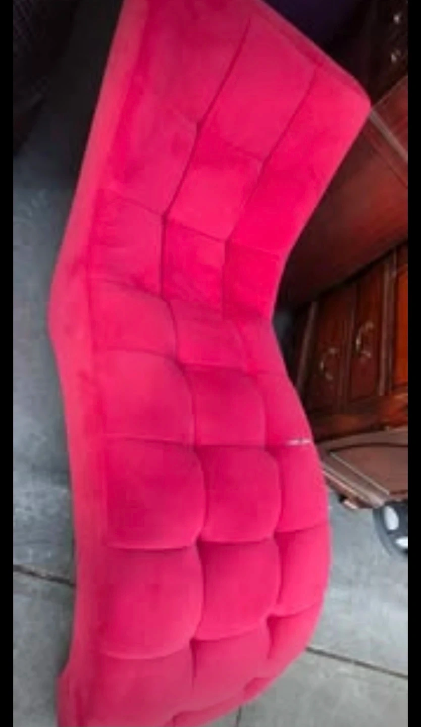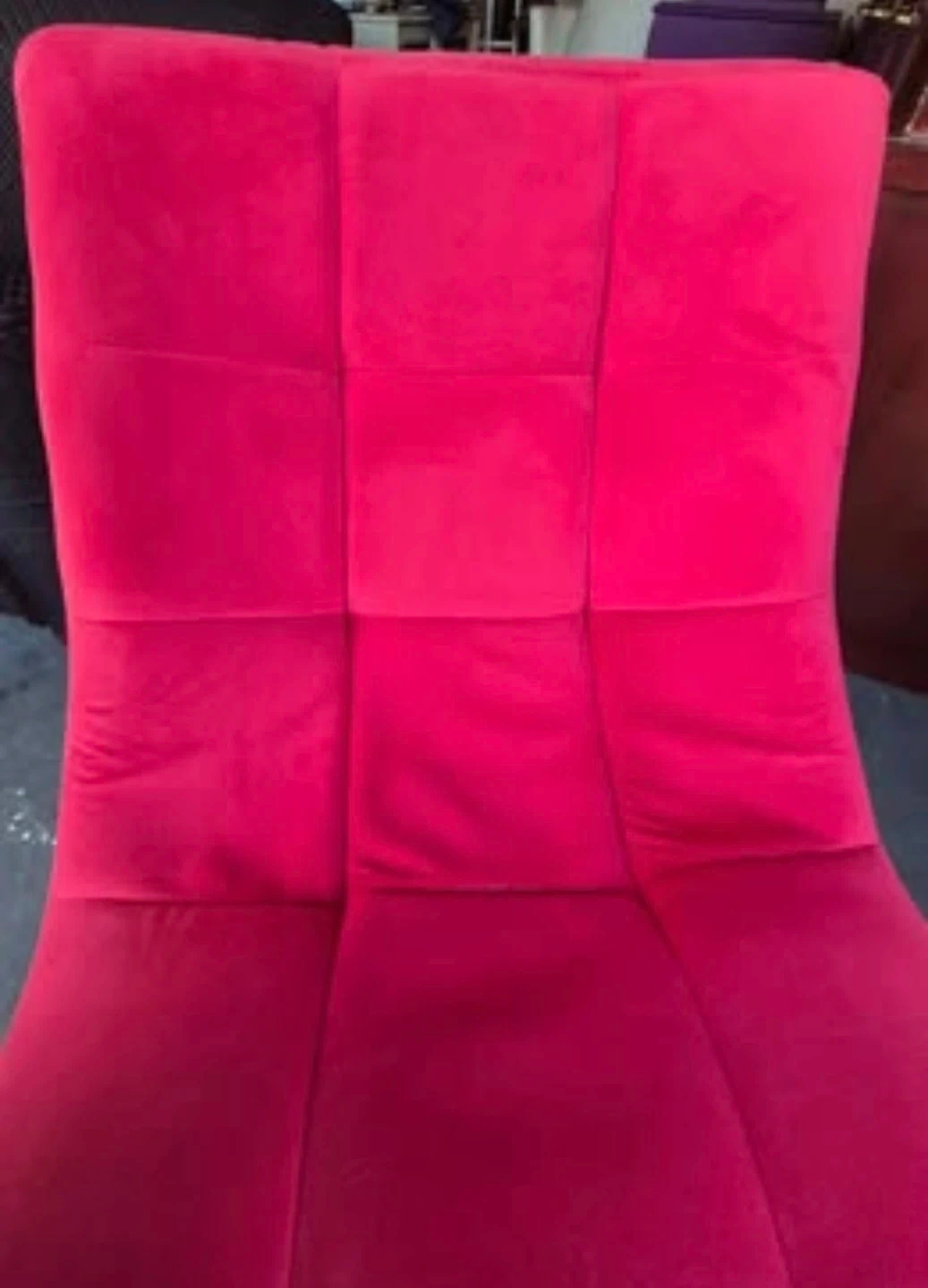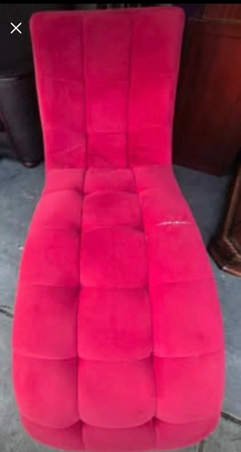 This plush lounge chair features a vibrant pink upholstery with a tufted design. It's comfortable and stylish, perfect for adding a pop of colour to any room. Some minor wear is visible.