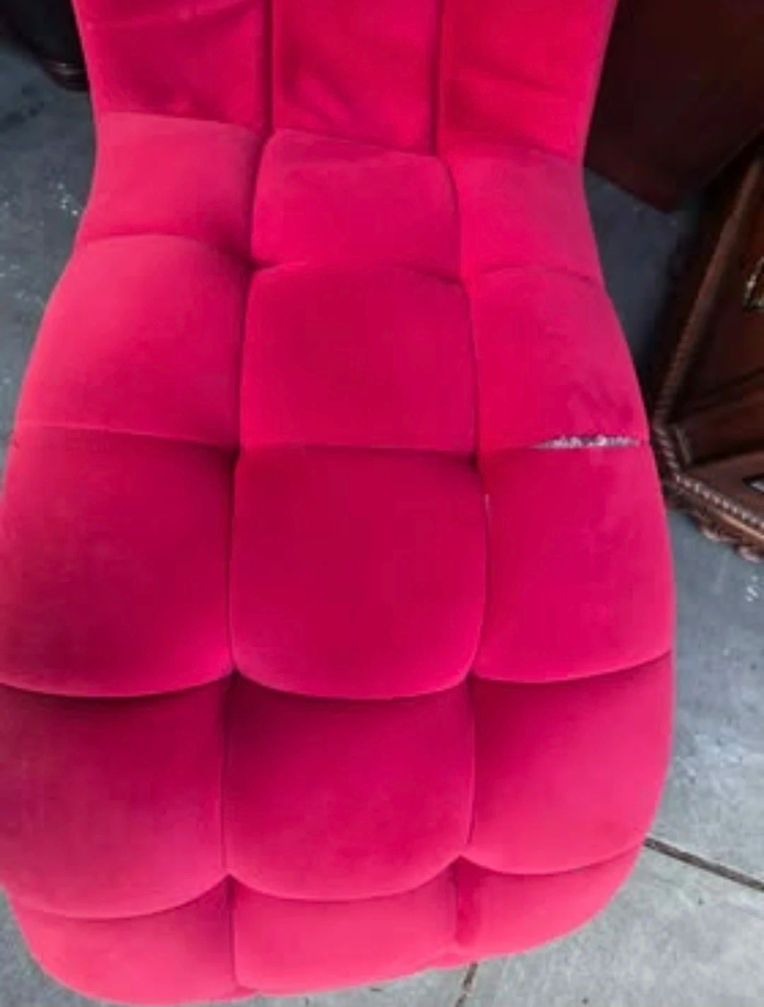 This plush lounge chair features a vibrant pink upholstery with a tufted design. It's comfortable and stylish, perfect for adding a pop of colour to any room. Some minor wear is visible.