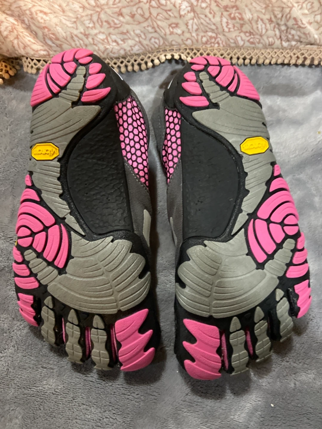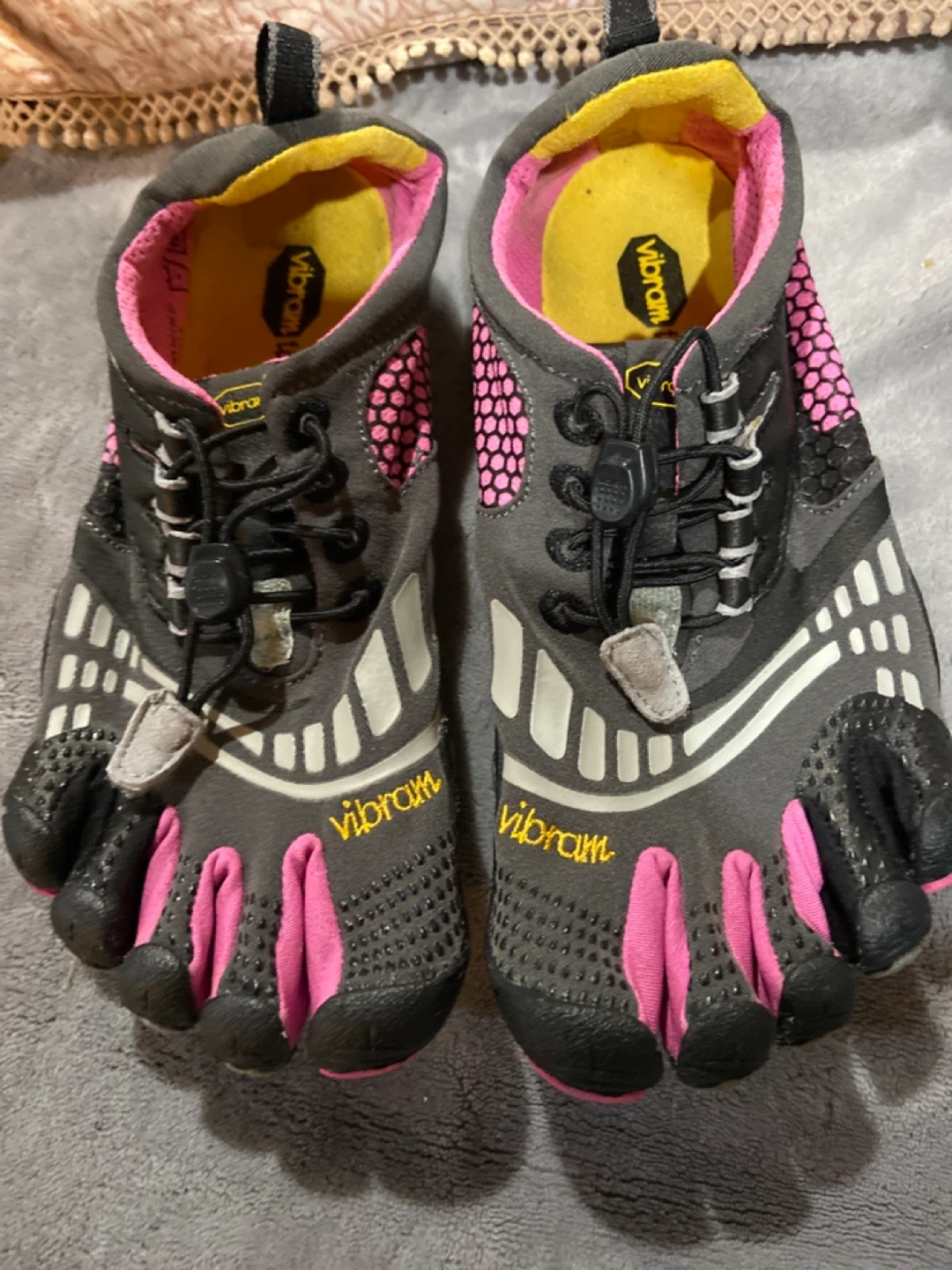 These Vibram FiveFingers are designed for running and outdoor activities. They feature individual toe pockets for a natural feel. The durable rubber sole provides excellent grip. Size 6.5 / 7 asking 10 for them