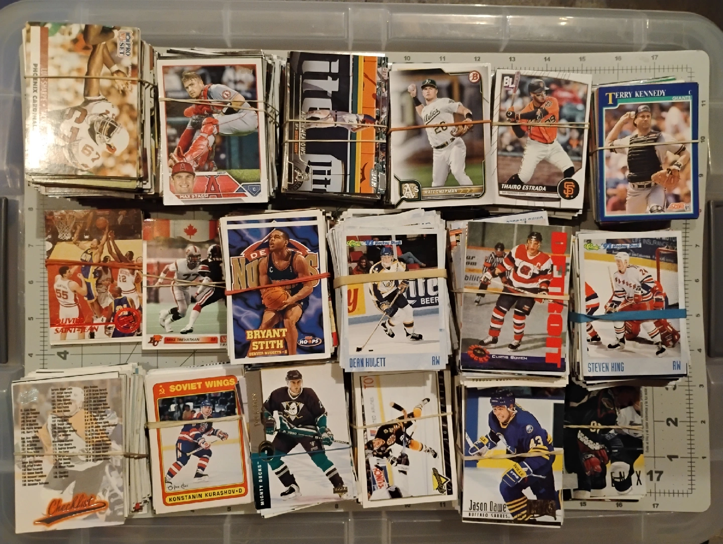 Included is the bonus lot of sport cards. They are nearly all hockey with some basketball, football, and baseball too. They are nearly all from the 90s and are common cards. Great for nostalgia and enjoying, and to use as placeholders in your frame