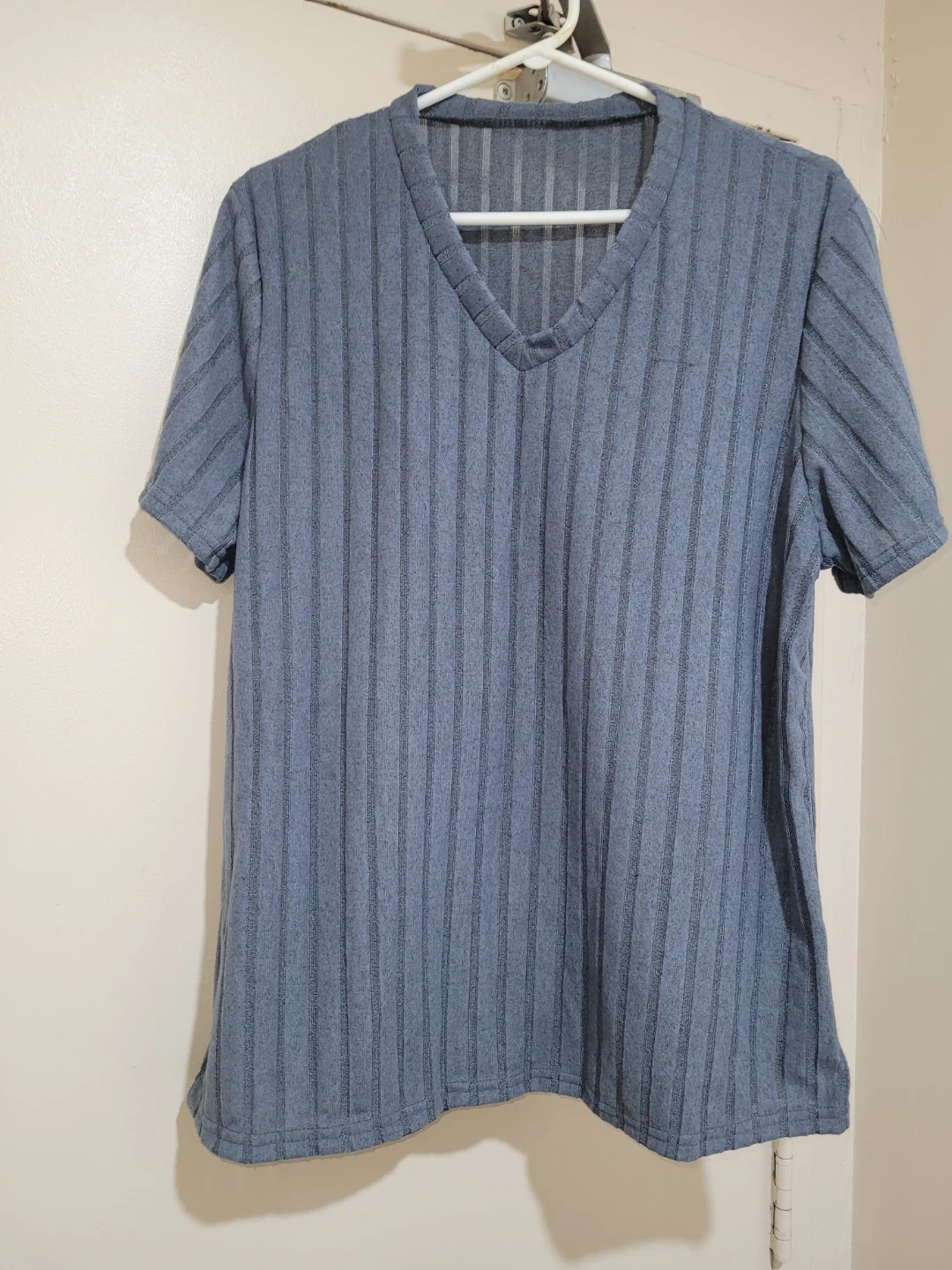 This is a blue short-sleeve t-shirt with a ribbed texture. It has a V-neckline. Material is soft and breathable. Perfect for casual wear!