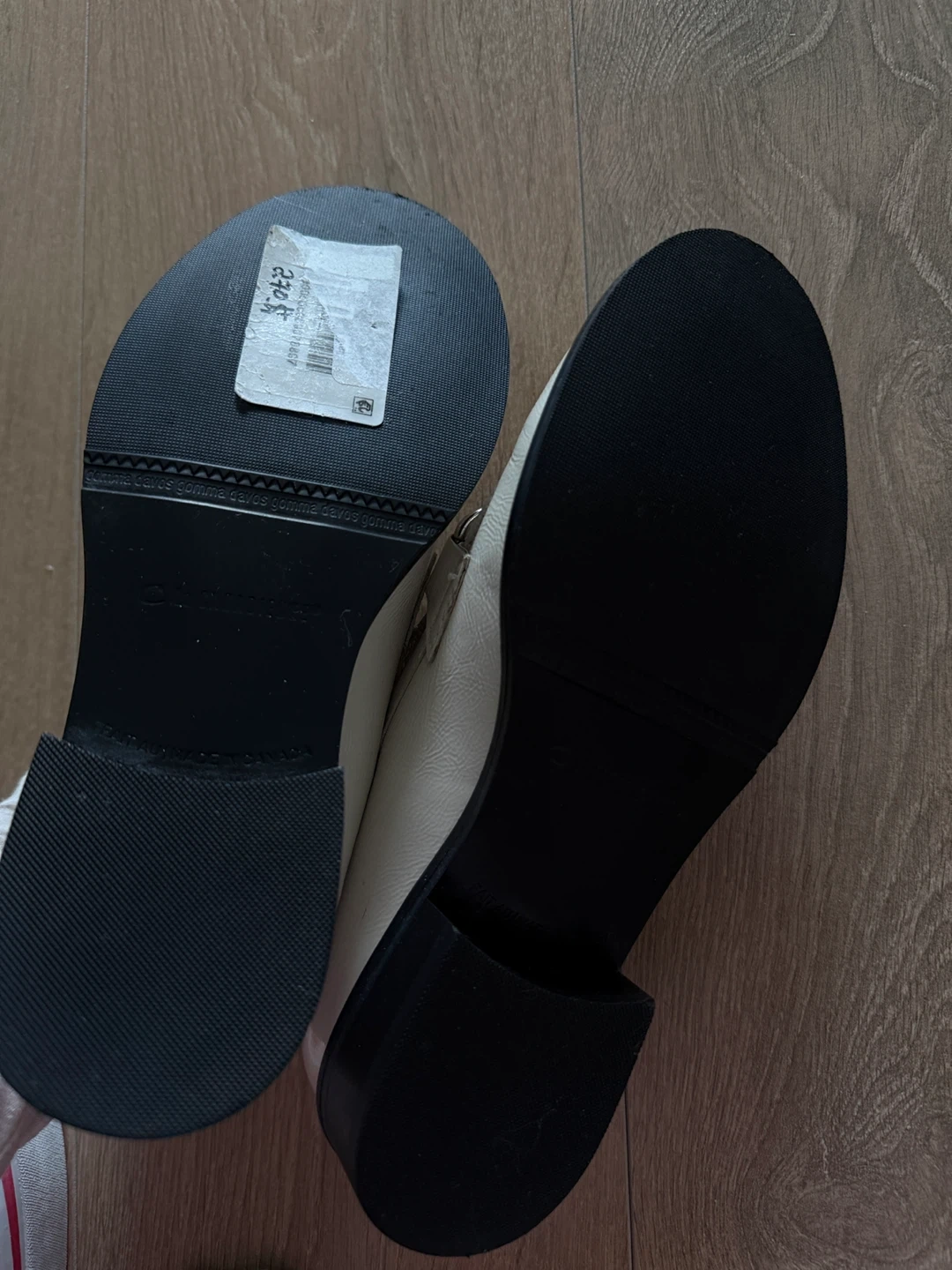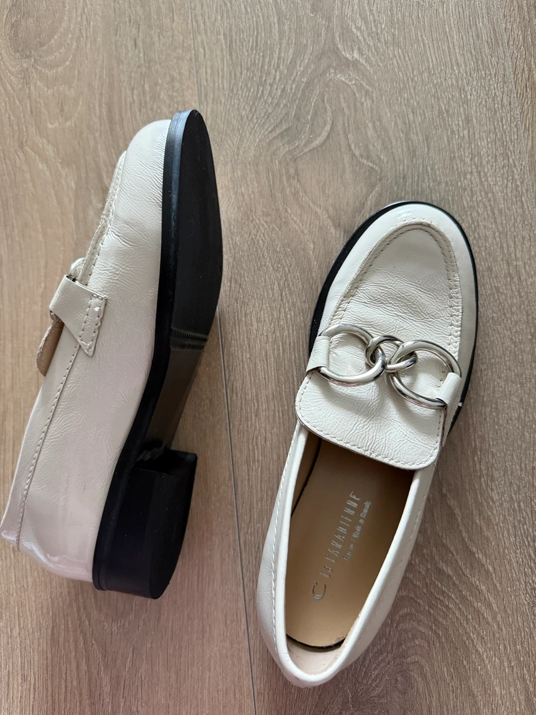 A pair of white leather loafers with silver hardware from La Canadinne. Originally bought for $300 from Holt renfrew. The loafers appear to be made of leather. Nice for commute.- $100
