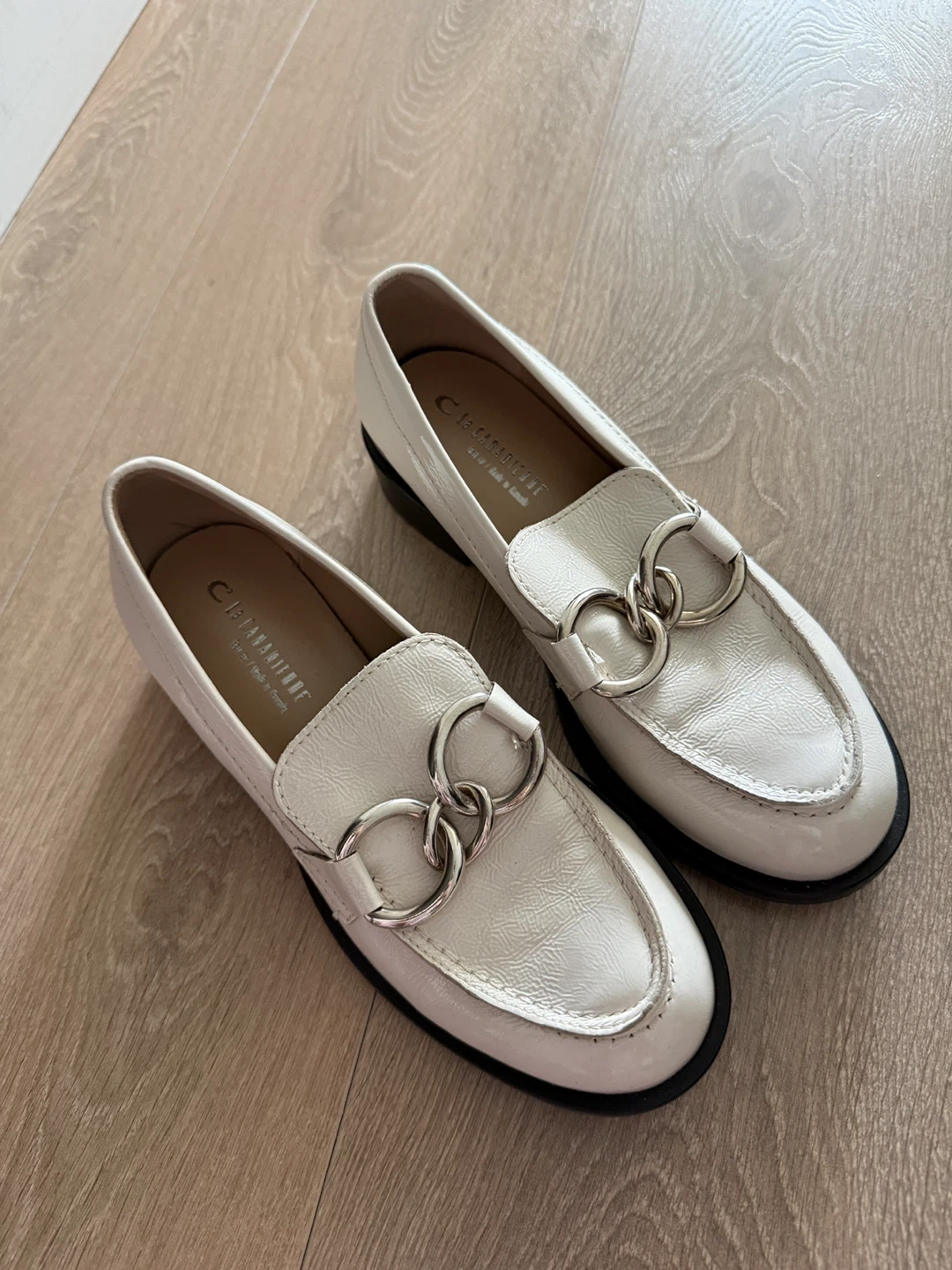 A pair of white leather loafers with silver hardware from La Canadinne. Originally bought for $300 from Holt renfrew. The loafers appear to be made of leather. Nice for commute.- $100