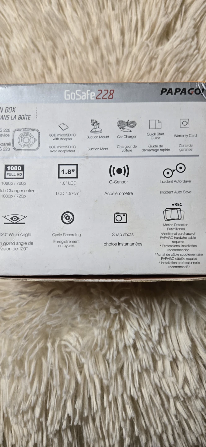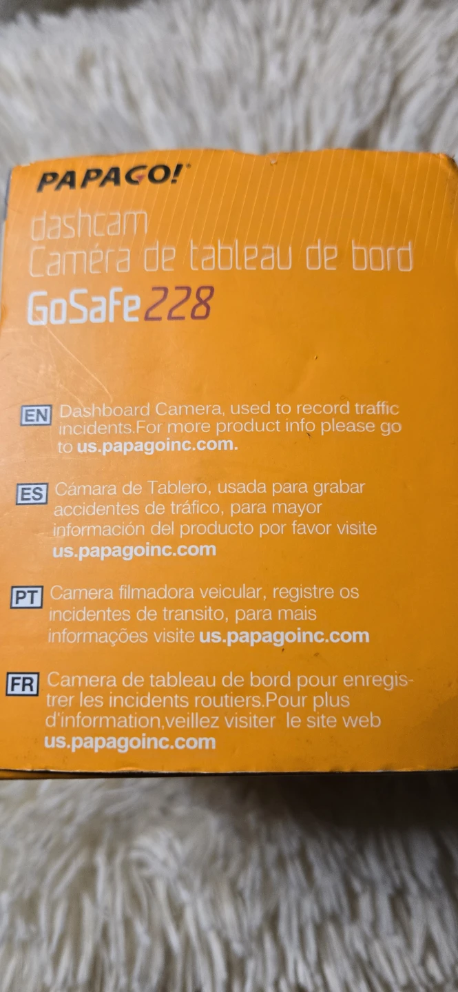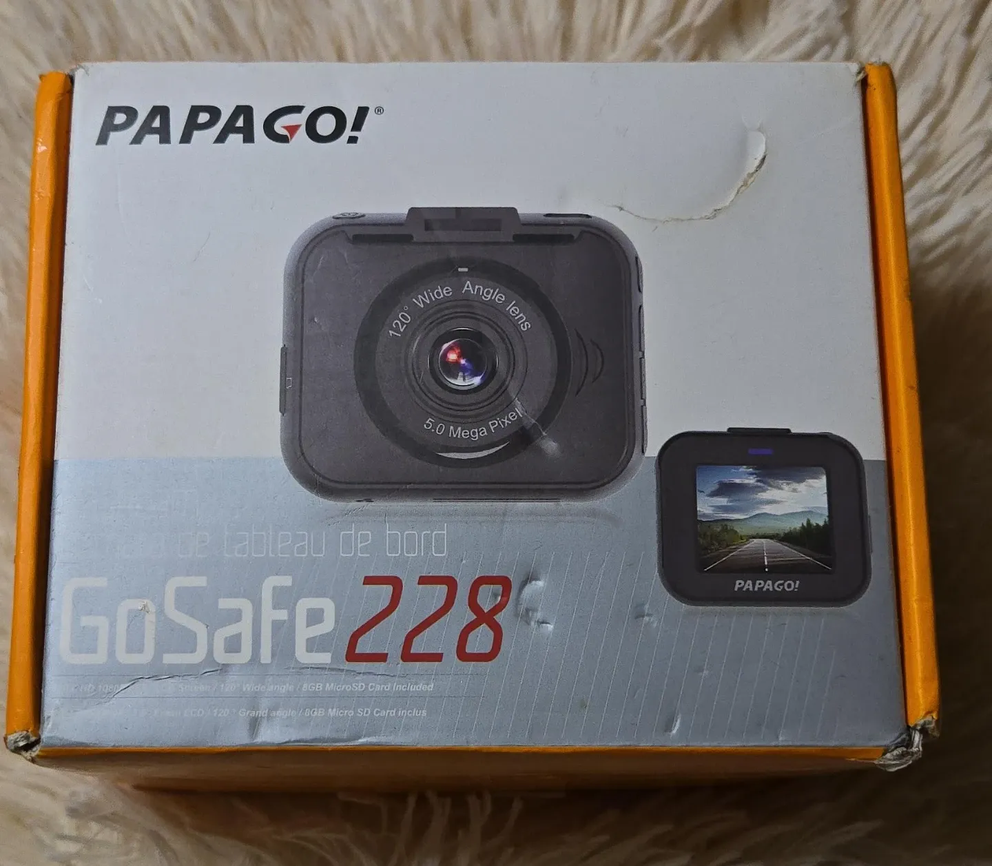 Selling a PAPAGO! GoSafe 228 dashcam still in its original packaging! It comes with all the original components, including an 8GB microSD card, suction mount, car charger, quick start guide, and warranty card. This dashcam records in 1080p full HD and has a 120° wide-angle lens. It also features a G-sensor and incident auto-save function.