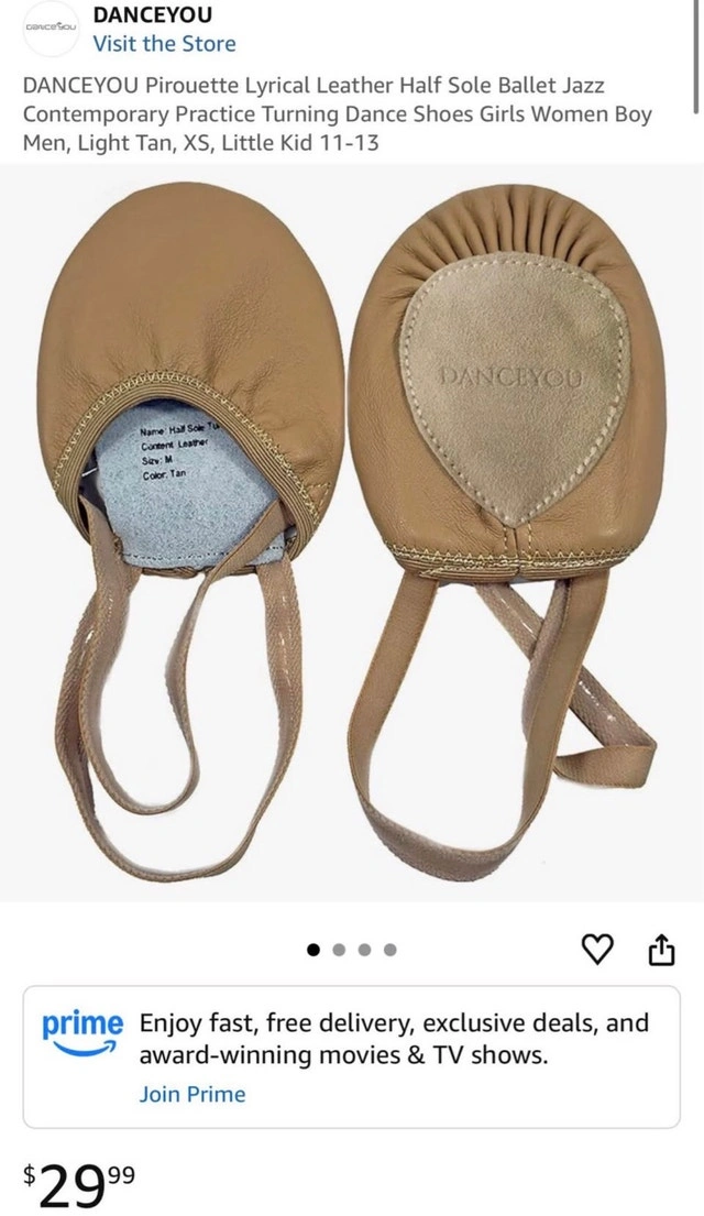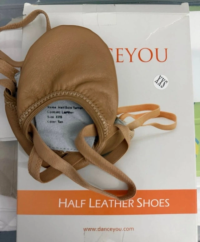 DanceYou pirouette half sole dance shoes in light tan. Great for ballet, jazz, lyrical, and contemporary dance. Size: XXS (Little Kid 10–10.5). Fits foot length: 6.5”–7” (170–180 mm). Material: Soft leather. Condition: New / never used.