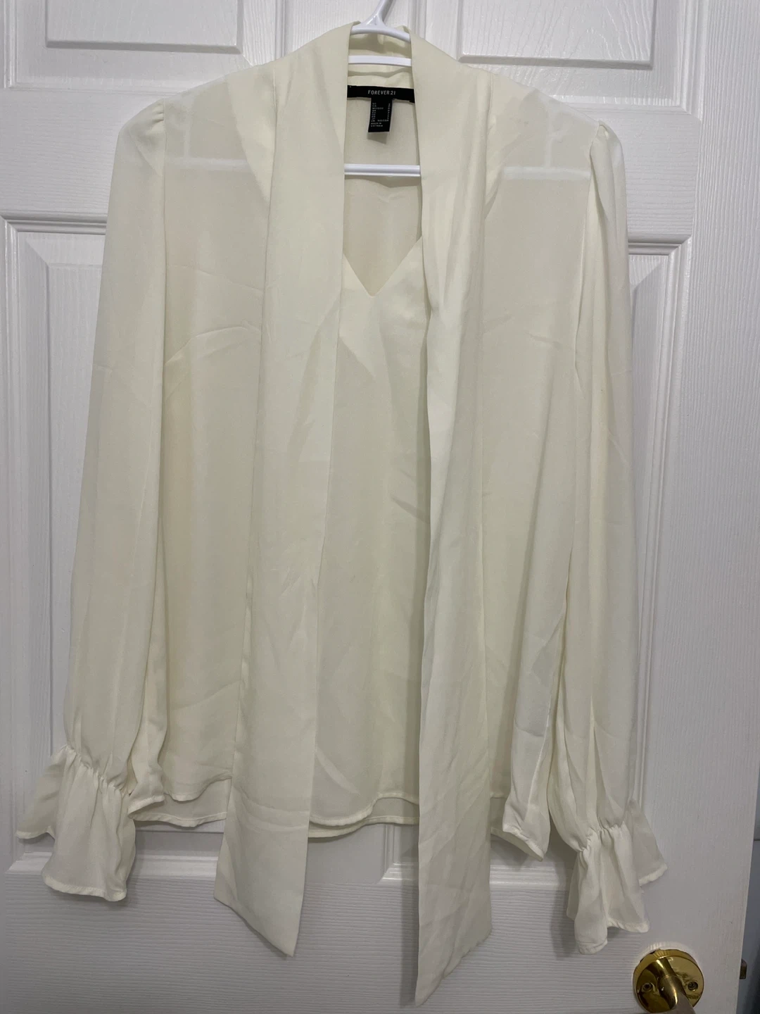 Selling a Forever 21 blouse in a lovely cream colour. It's a size small and features a stylish tie detail at the neck and cute ruffled cuffs. Perfect for dressing up or down!