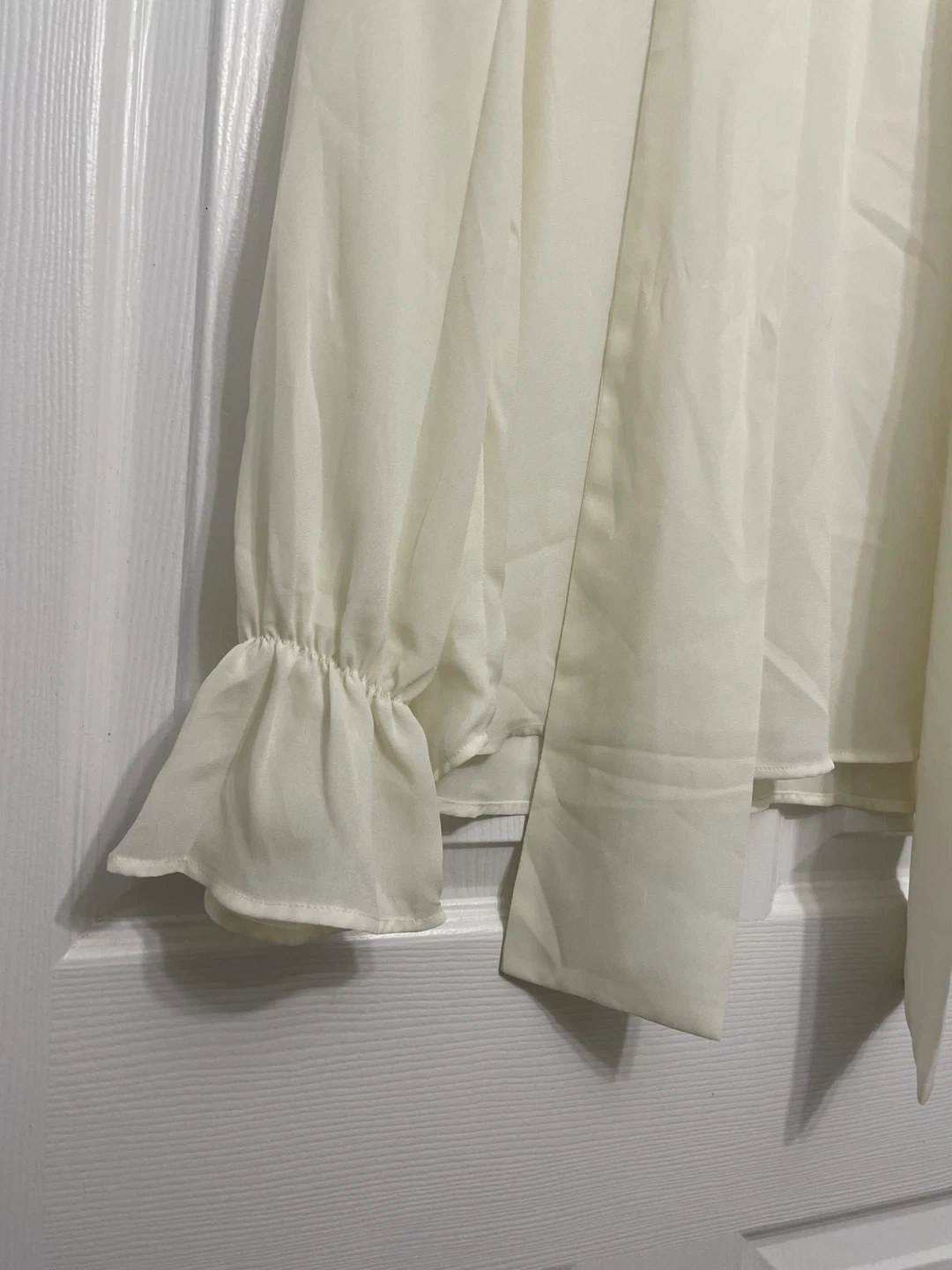 Selling a Forever 21 blouse in a lovely cream colour. It's a size small and features a stylish tie detail at the neck and cute ruffled cuffs. Perfect for dressing up or down!