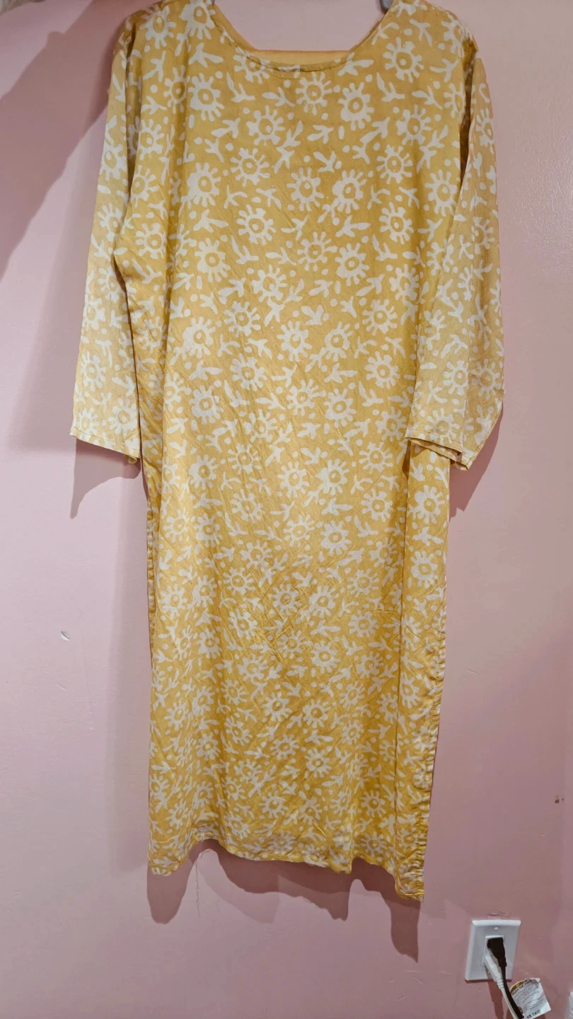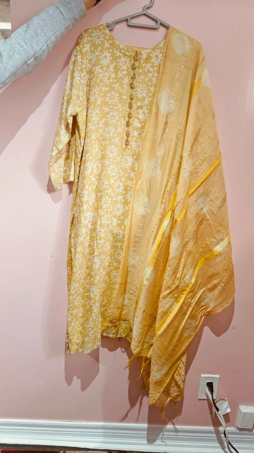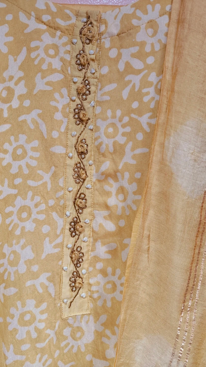 This is a three-piece Indian ethnic wear set. It includes a yellow kurti with a white floral print and decorative beading on the neckline. A matching dupatta and pants are also included. Made of lightweight fabric, it's comfortable for everyday wear or any occasion.