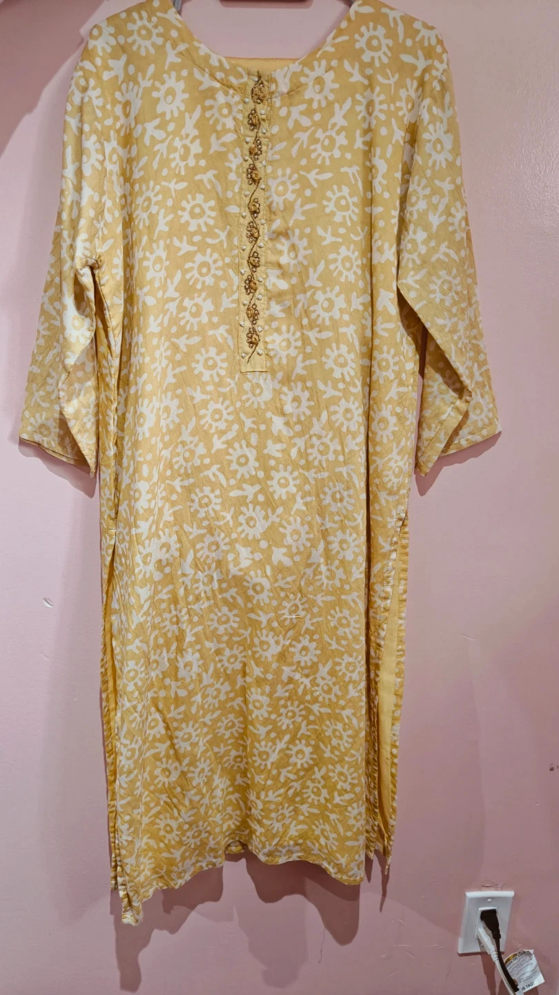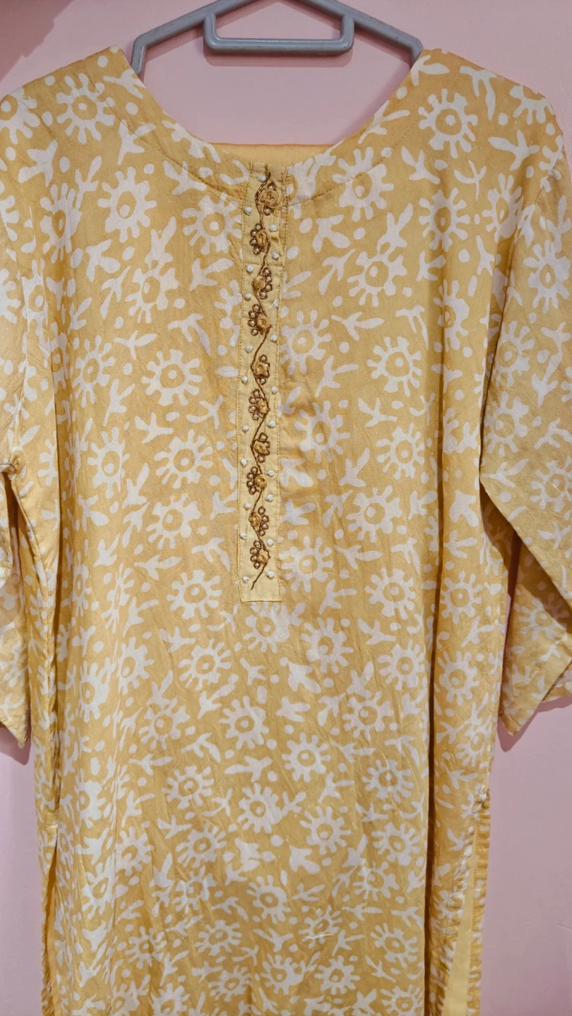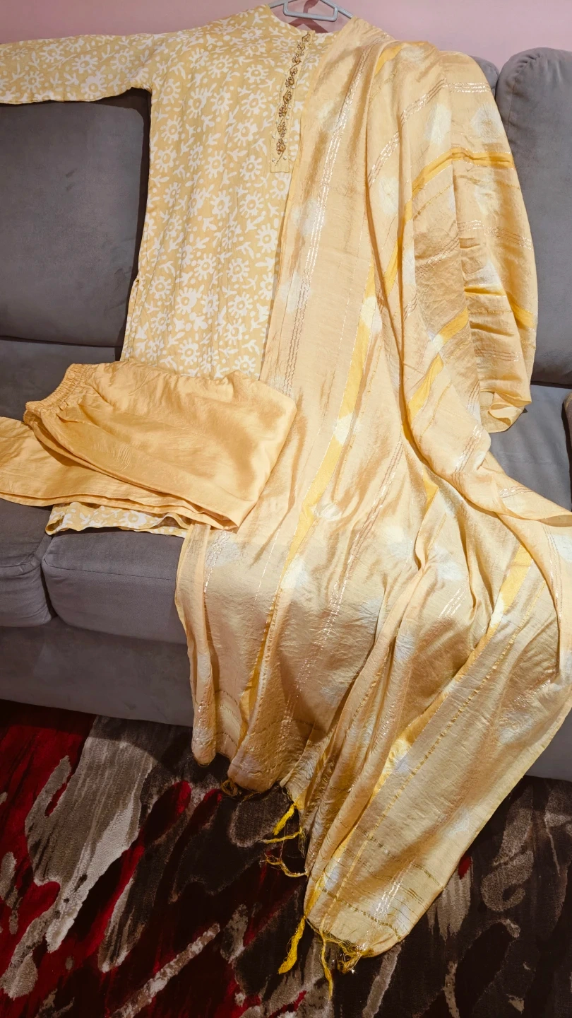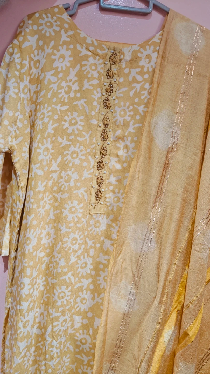 This is a three-piece Indian ethnic wear set. It includes a yellow kurti with a white floral print and decorative beading on the neckline. A matching dupatta and pants are also included. Made of lightweight fabric, it's comfortable for everyday wear or any occasion.