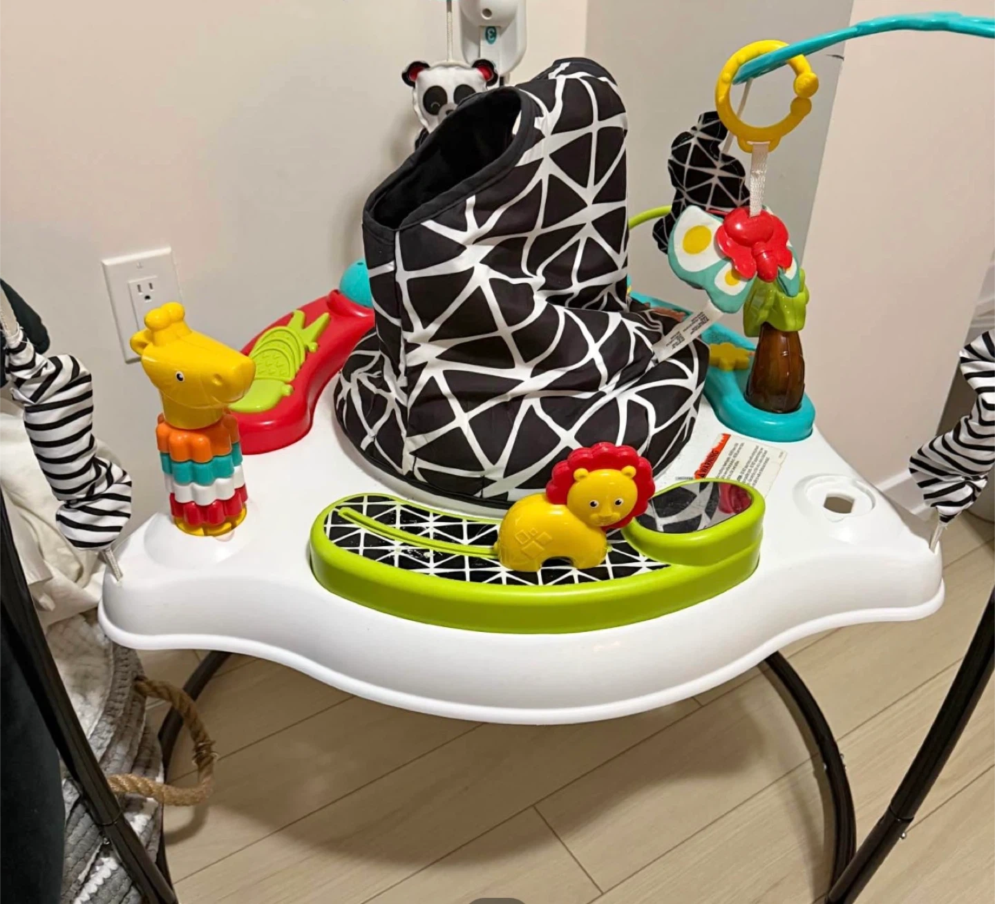 This Baby Einstein activity jumper offers a variety of engaging toys for little ones. It's designed for playtime and exploration with multiple interactive elements. The seat swivels, allowing baby to reach different toys.