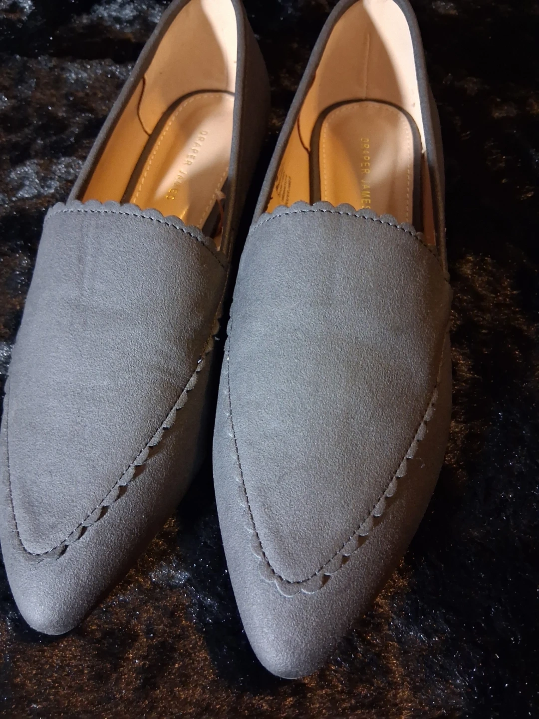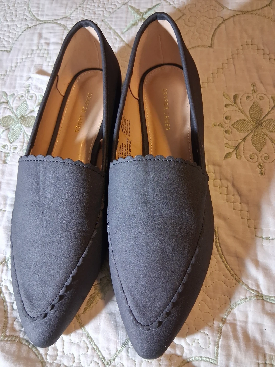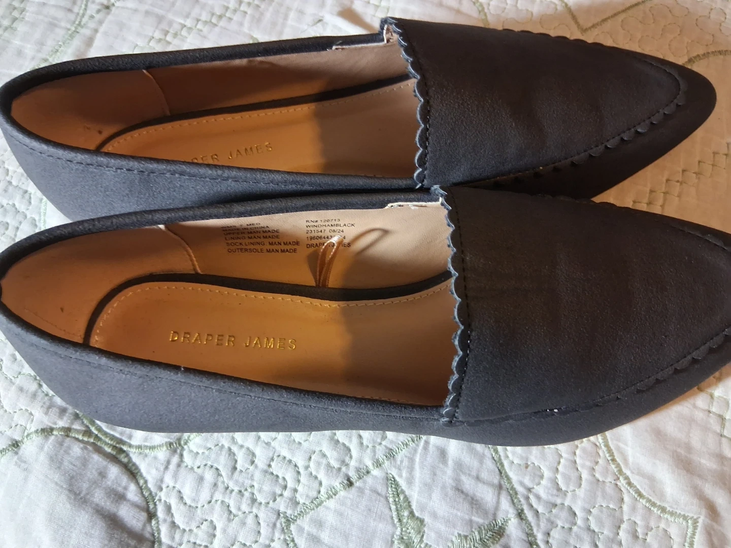 These Draper James loafers are a stylish black suede. The sock lining and outsole are man-made. They feature a cute scalloped trim detail. Perfect for casual or dressed-up wear!