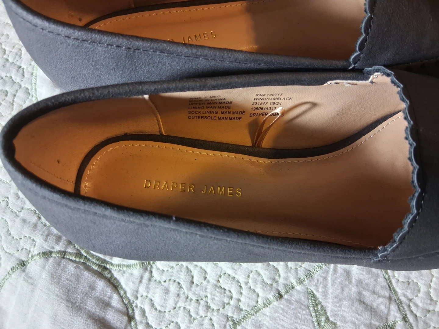 These Draper James loafers are a stylish black suede. The sock lining and outsole are man-made. They feature a cute scalloped trim detail. Perfect for casual or dressed-up wear!
