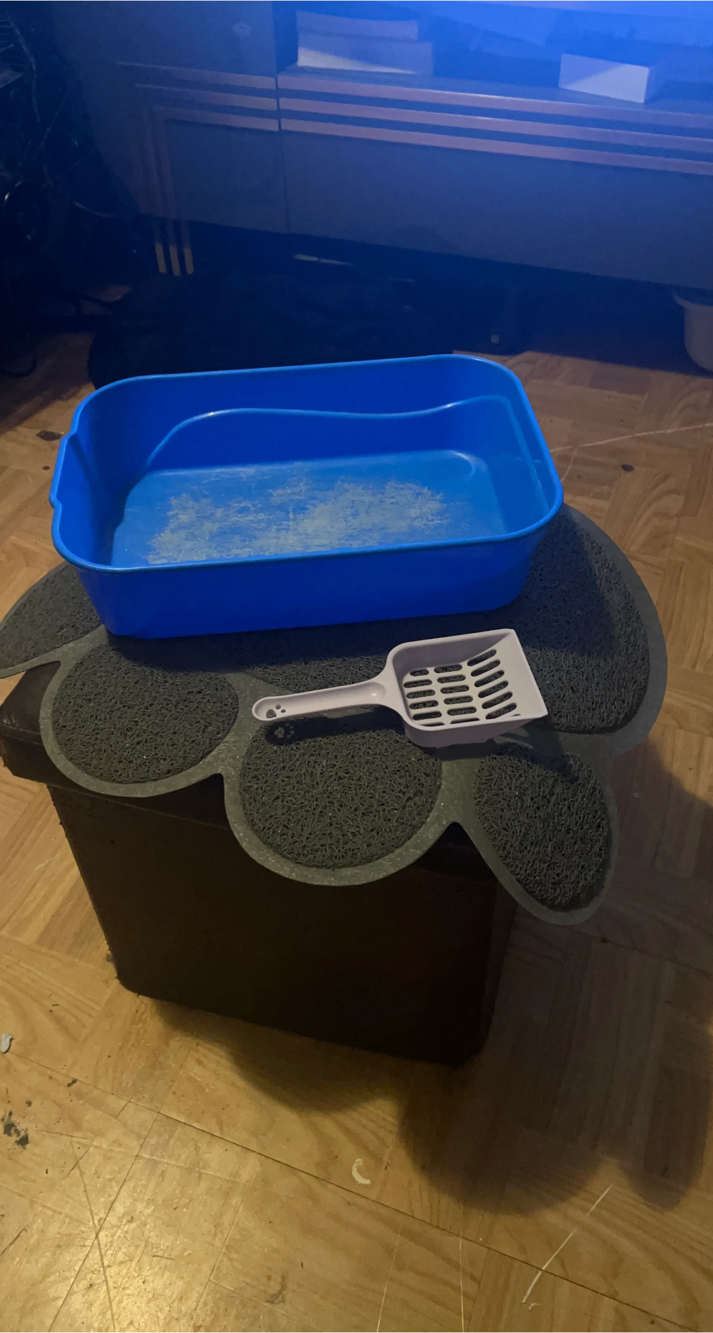 This is a blue plastic litter box, complete with a white plastic scoop and a dark gray paw print shaped mat. It's a convenient setup for any cat owner. The mat helps to catch litter from your cat's paws.